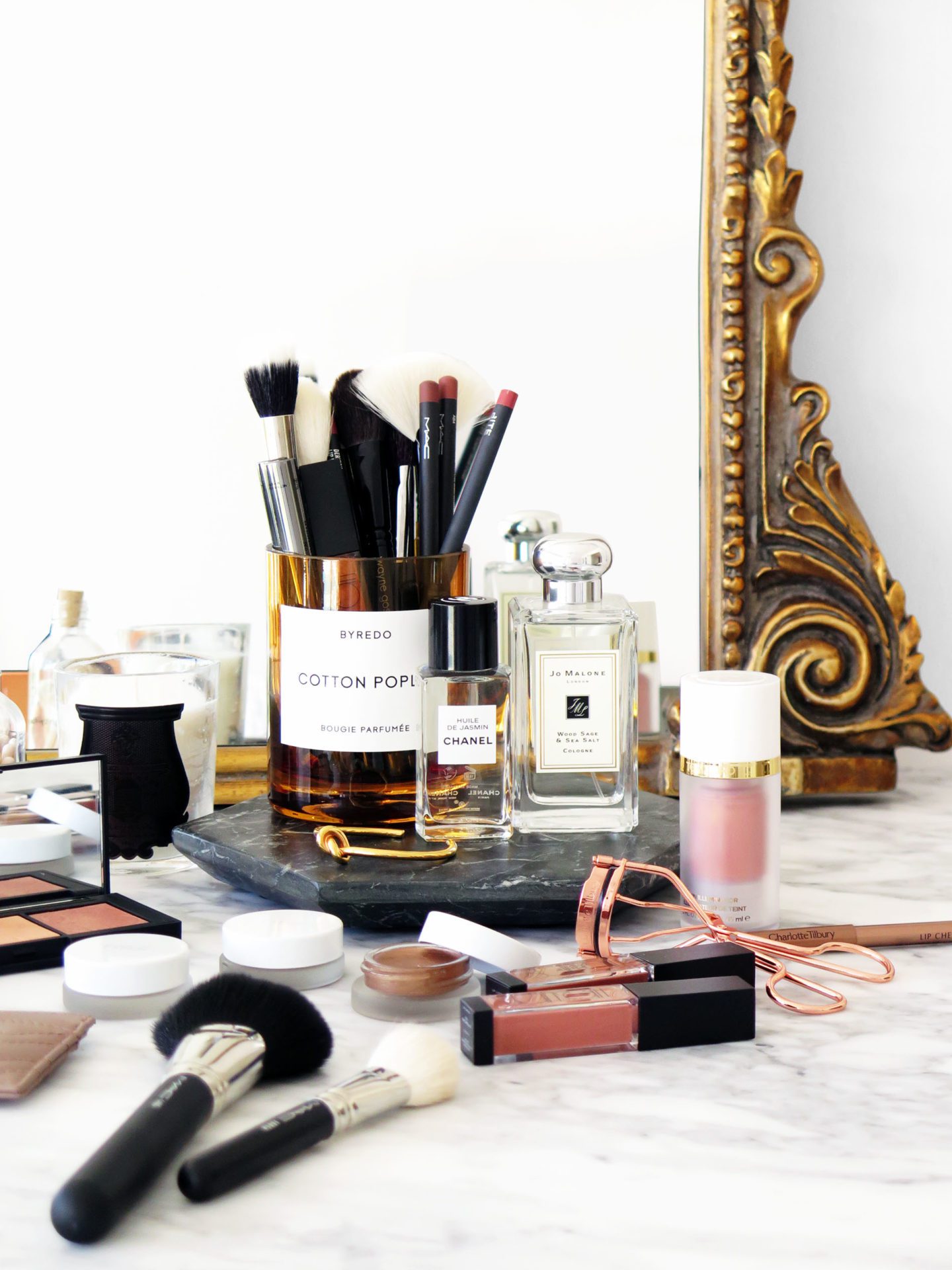 Shown in top and bottom image, mirror from Anthropologie, black marble trivet from Willams-Sonoma, table from Crate and Barrel. Rose-gold eyelash curler from Charlotte Tilbury. Card case by Gucci. Recycled candle by Byredo (color is limited-edition).