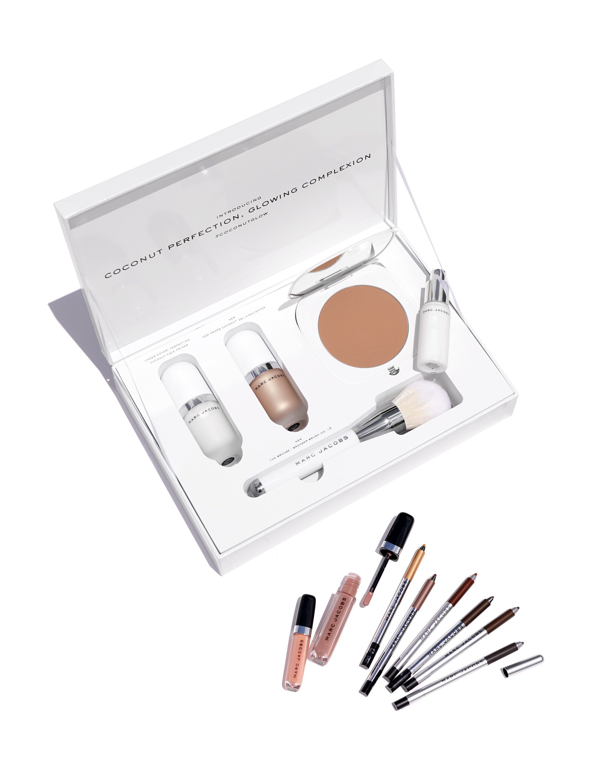 - Marc Jacobs Coconut Gel Highlighter in Dew You? on the cheeks and eyes
