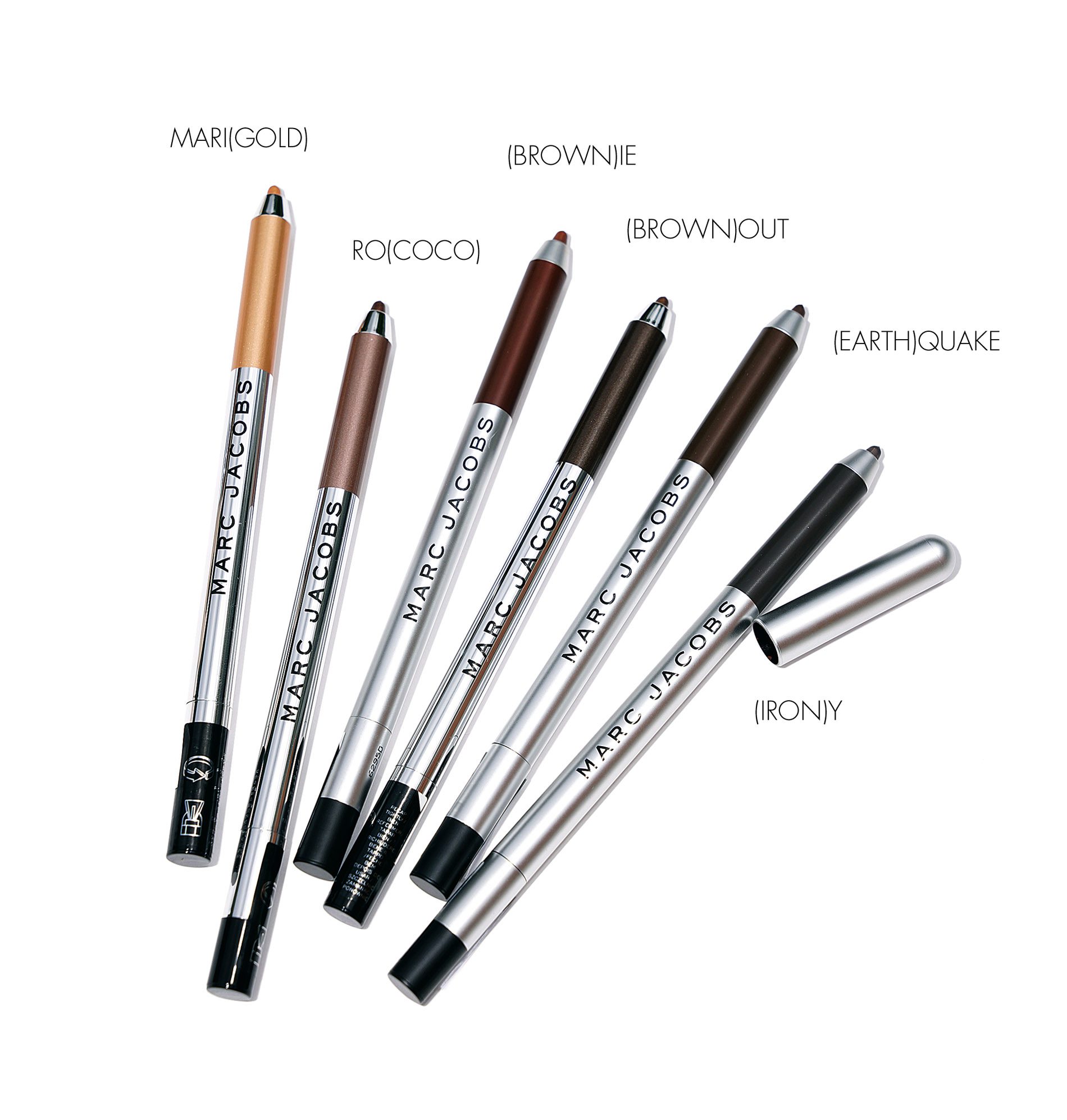 Marigold is a bright shimmery yellow gold, Rococo is a shimmery taupe brown, Brownie is a matte warm brown, Brownout is a deep shimmering brown, Earthquake is a matte deep brown, Irony is a matte grey black.