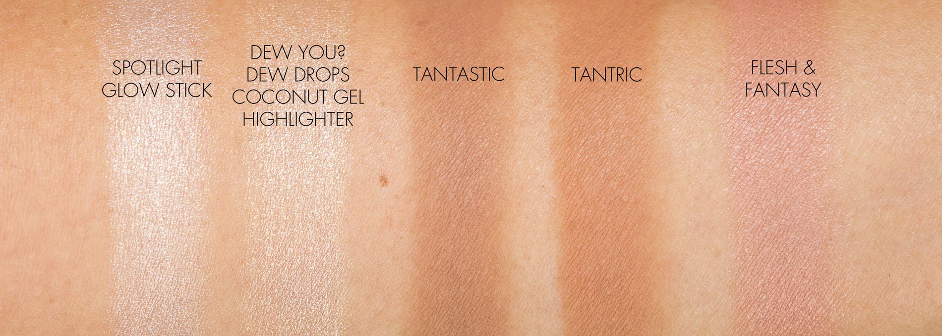Swatches below also shown next to the Marc Jacobs Beauty Spotlight Glow Stick, O!Mega Bronzer in Tantric which is warmer (on the face here), and Air Blush in Flesh and Fantasy (reviewed here). If you already have the Spotlight Glow Stick I don’t think you need both – they have a similar effect, unless you want something to mix into foundation then the drops make more sense for that purpose. Also the Dew You drops have that amazing coconut smell, but color-wise they look very similar on my skin.