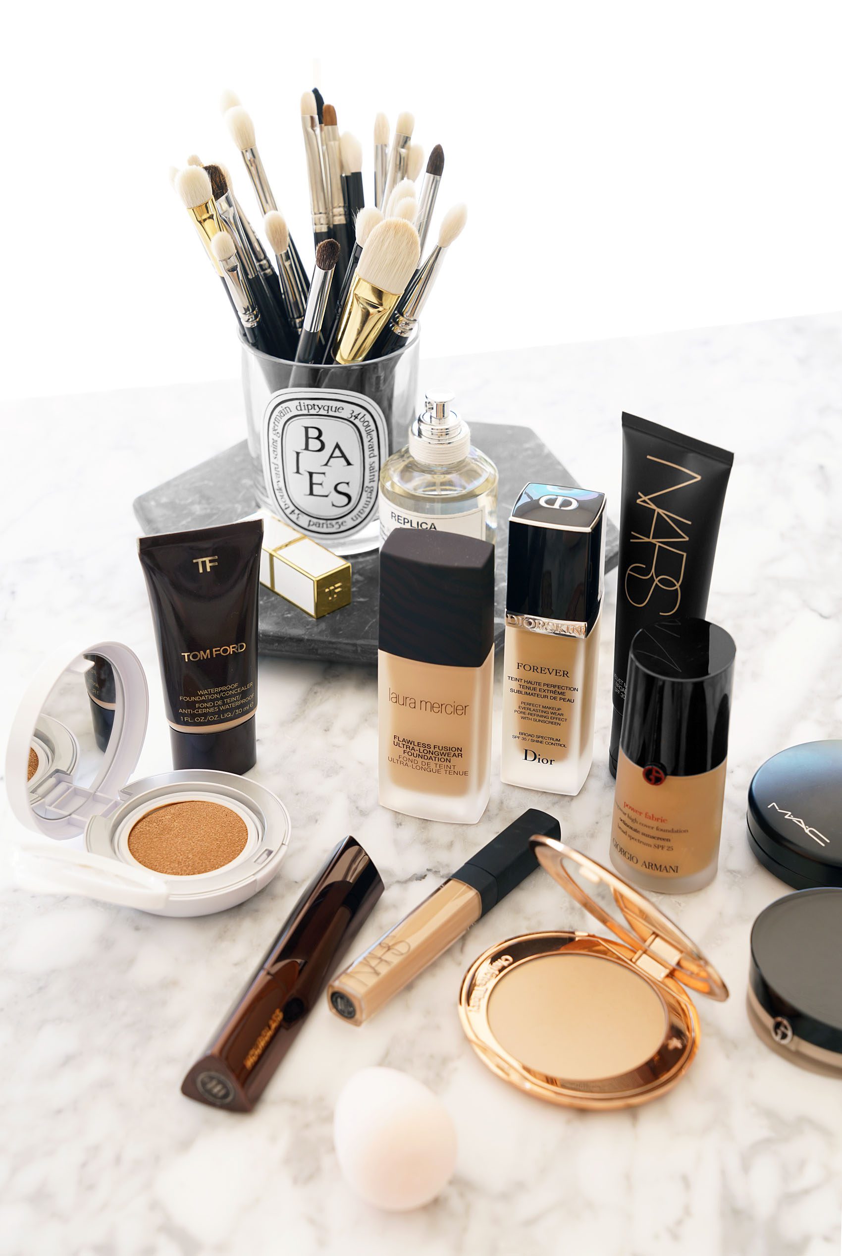 Press samples featured include the Laura Mercier Flawless Fusion, MAC Next to Nothing, Tom Ford Waterproof Foundation, Make Up For Ever Ultra HD Concealer, MAC Brush 140S Brush. All others purchased by me.