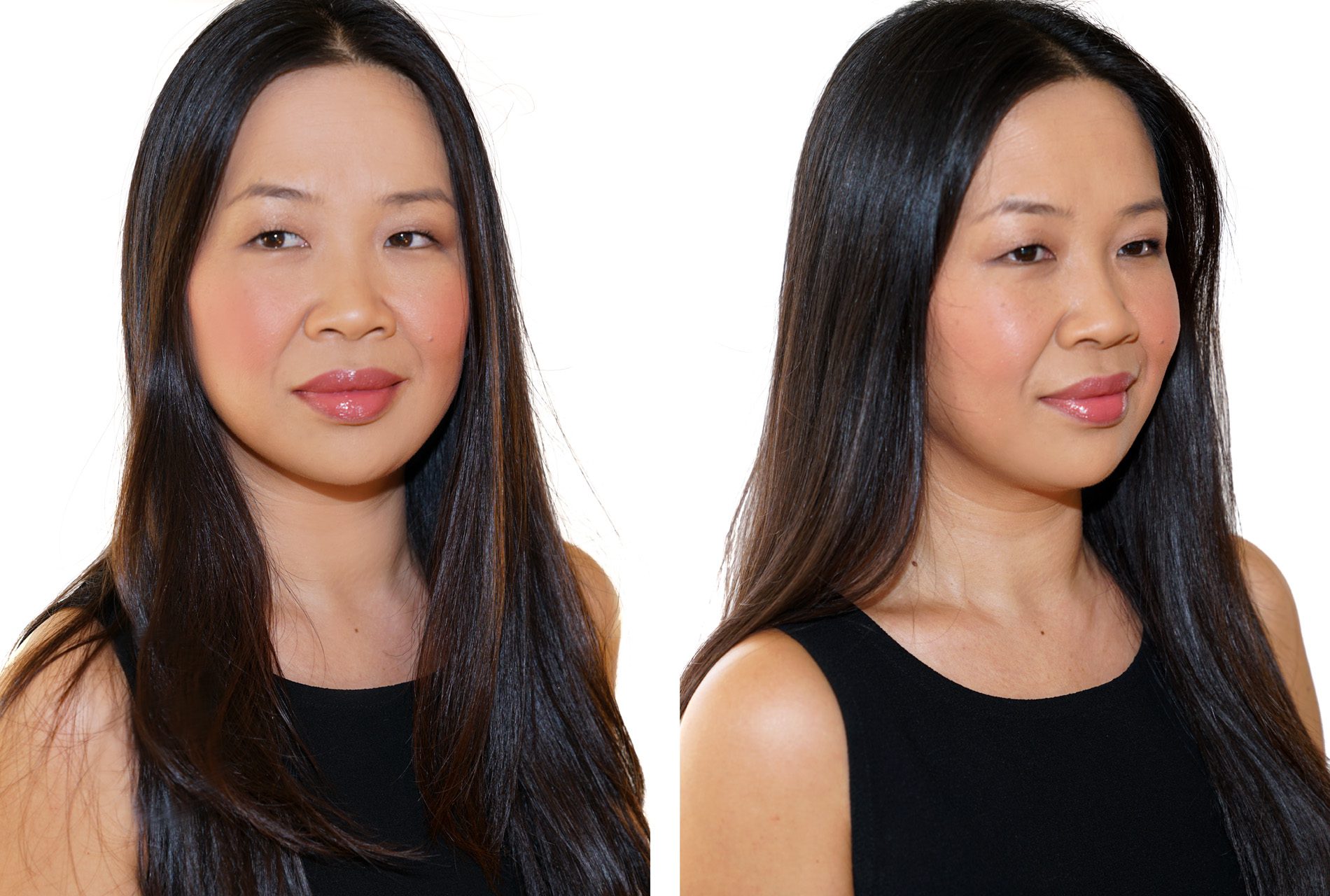 Shown below, on the left it’s layered with a heavier hand. On the right it has just a couple soft sweeps. Also worn on the face: