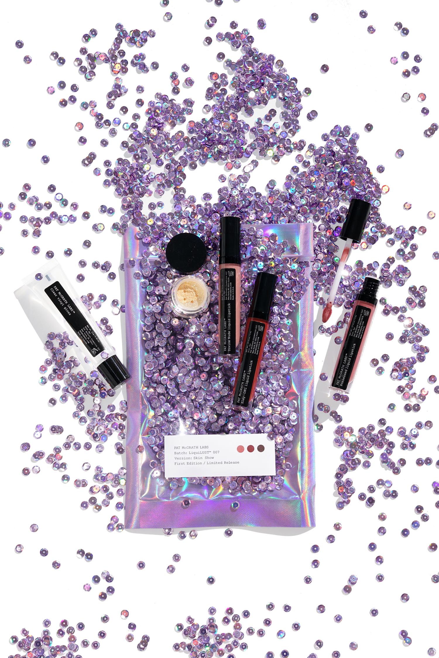 The LiquiLUST 007 is part of her limited-edition Lip Labs Collection. This set comes in an iridescent sealed pouch stuffed with lavender colored sequins. It’s definitely eye catching and fun but I have no idea what I’m going to do with all these little bits of iridescent purple sequins. Andrew was worried the cat would jump into my flatlays because he likes shiny things and get glitter all over the place. In reality he should be more concerned that I’d get it everywhere – there’s something about glitter and sequins that makes me think it would be super fun to just throw toss up in the air everywhere in the house.