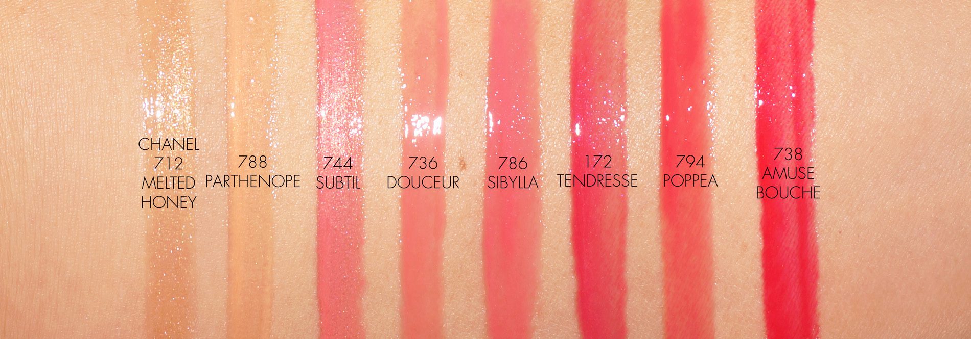 - Rouge Coco Gloss in 786 Sibylla, 788 Parthenope, 792 Aphrodite and 794 Poppea ($30 each)