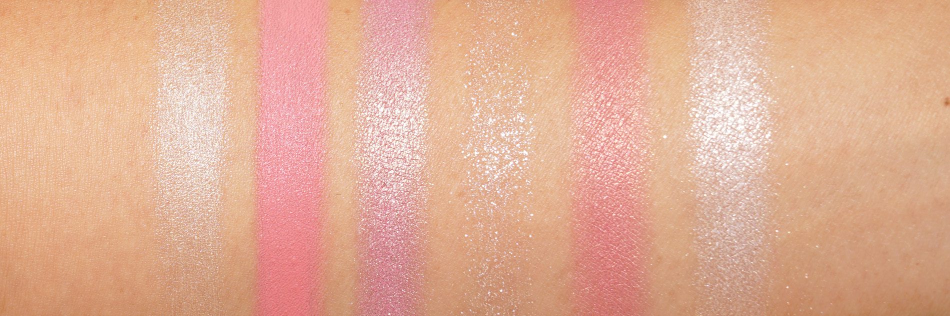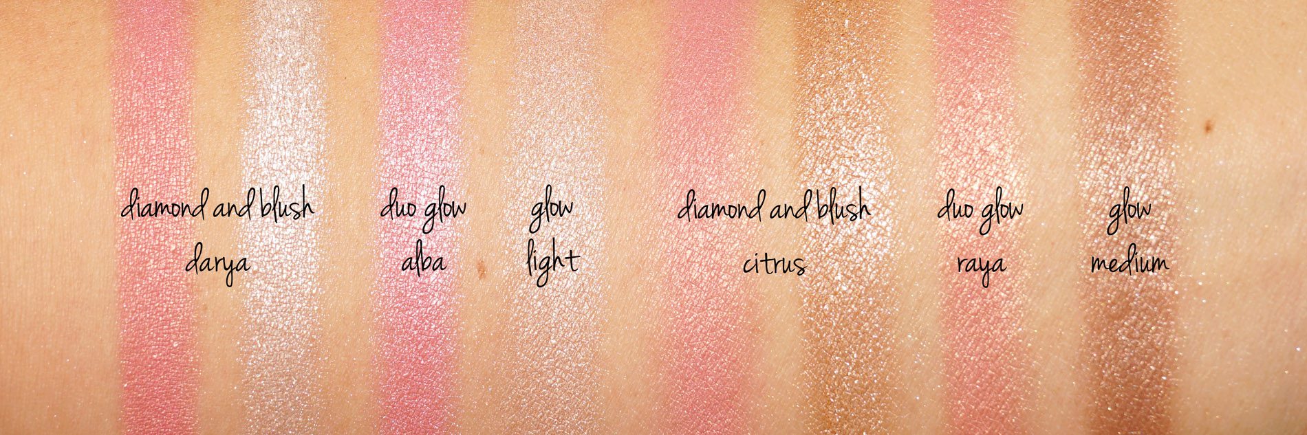 Based on the product descriptions I thought the Palette Duo Glows would be similar to the individual Duo Glows she launched last year. I found them completely different in finish/texture so instead I’ve compared the individual Duo Glows to the Powder Blush in the palettes (hope that’s not too confusing). I also pulled a couple of her individual Glow Powders to compare below.