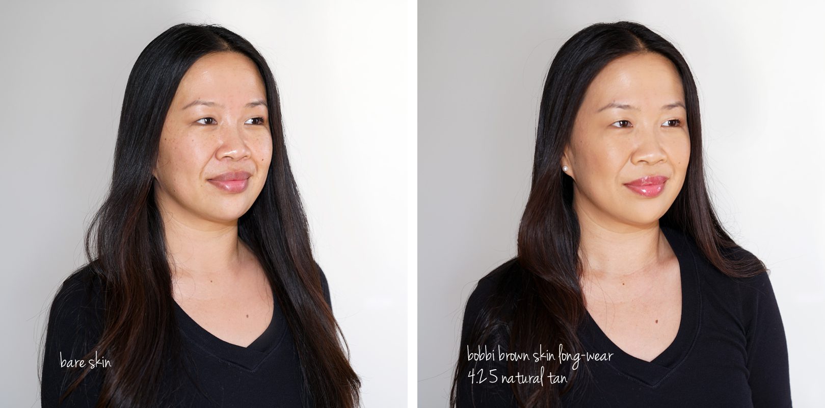 My bare skin vs an application of the shade Natural Tan 4.25 (no concealer or powder). Also added in the after picture is Chanel Rouge Coco Gloss in Tendresse, Hourglass Ambient Lighting Blush in Incandescent Electra Blush. Photos were taken with a flash, even though the Skin Long-Wear Foundation has SPF 15 I didn’t see any flash back.