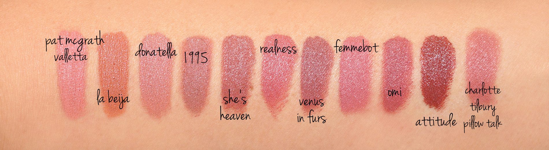 A few swatch comparisons. You can see these reviewed in my original Pat McGrath Labs LuxeTrance, MatteTrance, Permagel Eye and Lip Pencil Review. I’m missing Sextrology because I forgot to add it in the swatch lineup. I’ve added Charlotte Tilbury Pillow Talk for reference as it’s one of my favorite everyday neutrals.