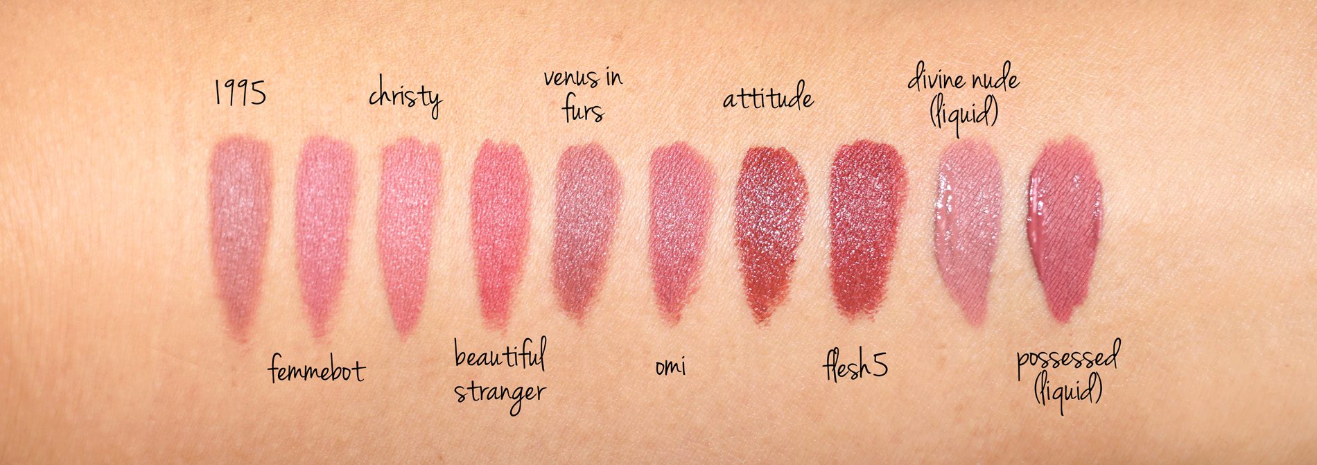 Two sets of swatch comparisons to other Pat McGrath MatteTrance, LuxeTrance (lip swatches here and here) and Liquid Lipstick shades (review here) and also a set with some Charlotte Tilbury Matte Revolution Swatches (reviewed here). To me Femmebot and Christy almost look identical, but Christy has a little bit more warmth and is a little bit lighter in color. Attitude and Flesh5 look close, but Attitude is the LuxeTrance formula and a little more brown while Flesh5 is matte and has more red tones.