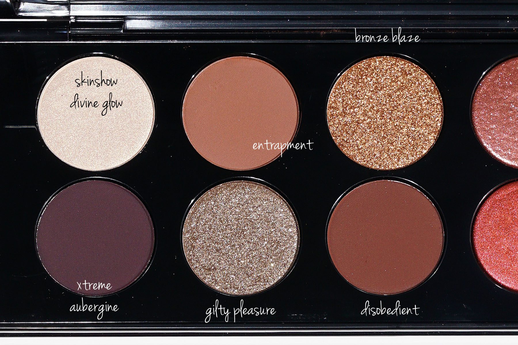 My favorites are Skinshow, Bronze Blaze and Gilty Pleasure. For the two glitters I find patting them over the mattes with my fingers resulted in a super pretty bronzed eye look. The color Rose Gold 005 is a super sparkly rose pink that flashes copper sparkle – it’s also a nice top coat shadow. Blitz Flame surprised me as I’m not a red shadow wearer but when I layer it with any of the matte browns it transforms into a deeper almost plum bronze with a little bit of red.