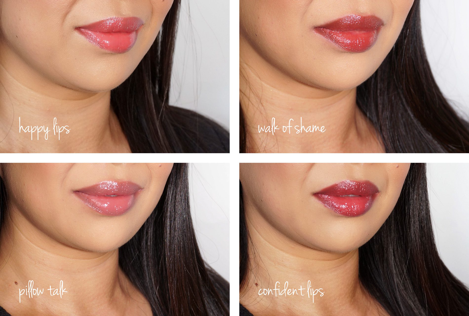 Happy Lips is my favorite, it’s a happy coral peach color. Walk of Shame is a warm glossy red. Pillow Talk is similar to the matte Pillow Talk, it’s a nude pink, I prefer the matte version because it shows up better on my lips. Confident Lips looks black in the tube but has that Clinique Black Honey vibe, it goes on a deep wine plum.