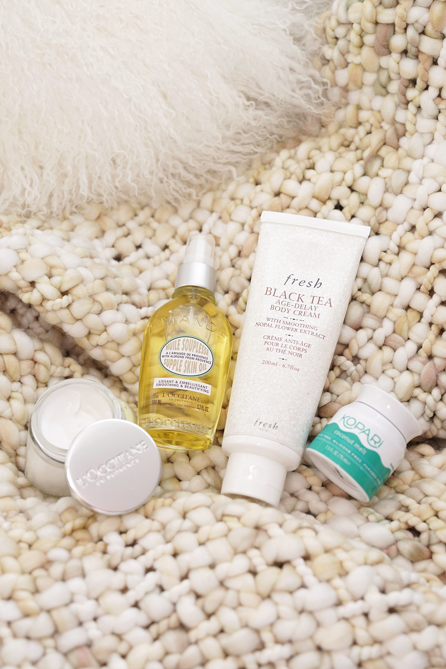 The best body creams that have medium to lighter weight finishes to me are the Fresh Black Tea Age Delay Body Cream and the Aesop Geranium Leaf Body Balm (not shown). For an ultra rich overnight game changer the Kopari Coconut Melt never fails to restore moisture and bounce to the skin.