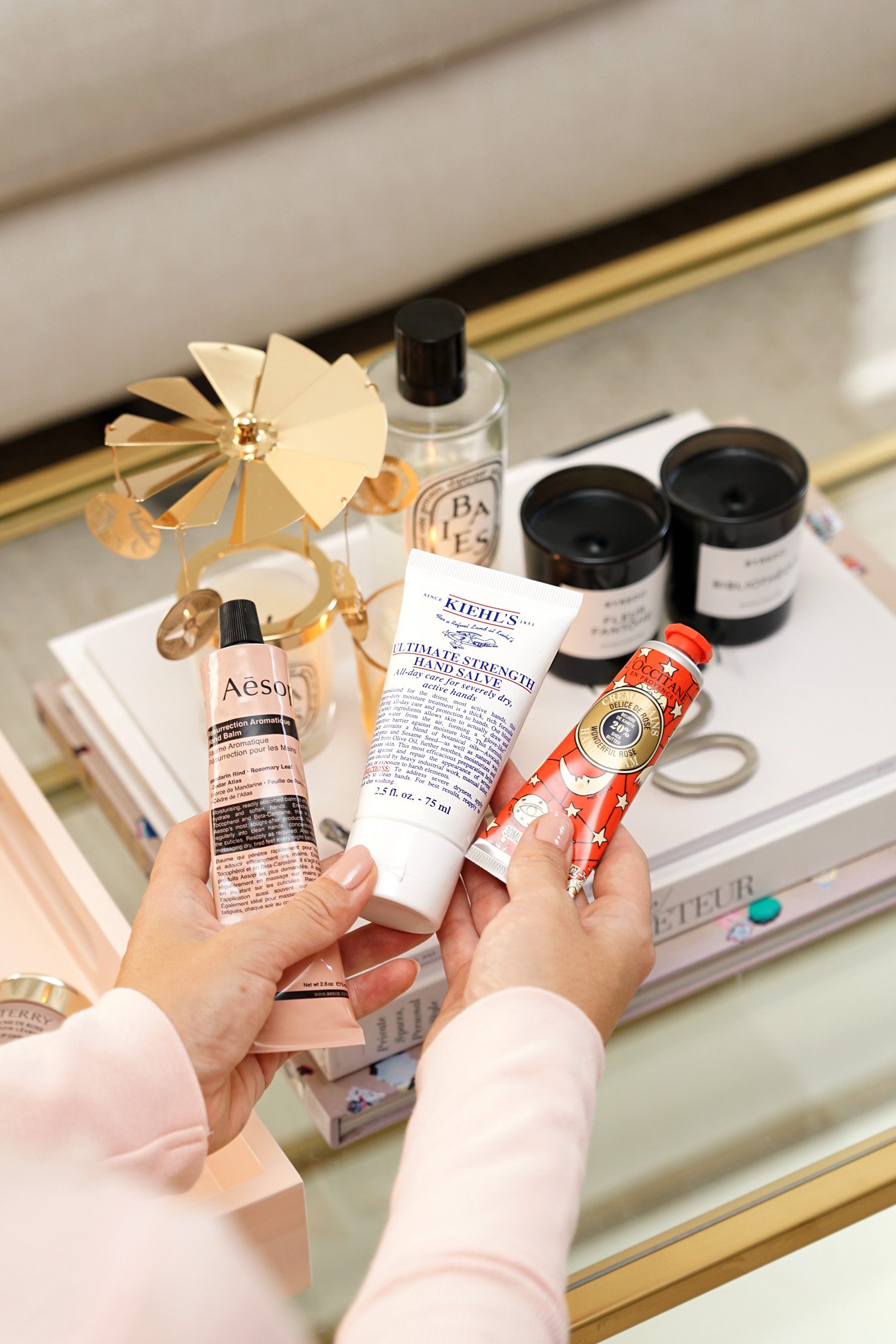 I love trying out hand creams. I usually prefer ones with a velvety finish but this time of year I need something stronger. My three favorites right now include the Aesop Resurrection Hand Balm (also comes in a larger pump bottle size) for an aromatic one, Kiehl’s Ultimate Strength Hand Salve is probably my favorite strong moisturizing hand cream and anything from L’Occitane is a no-fail option, I love their Holiday Hand Cream Trio with the Rose, Delightful Tea and Shea Butter in their festive packaging.