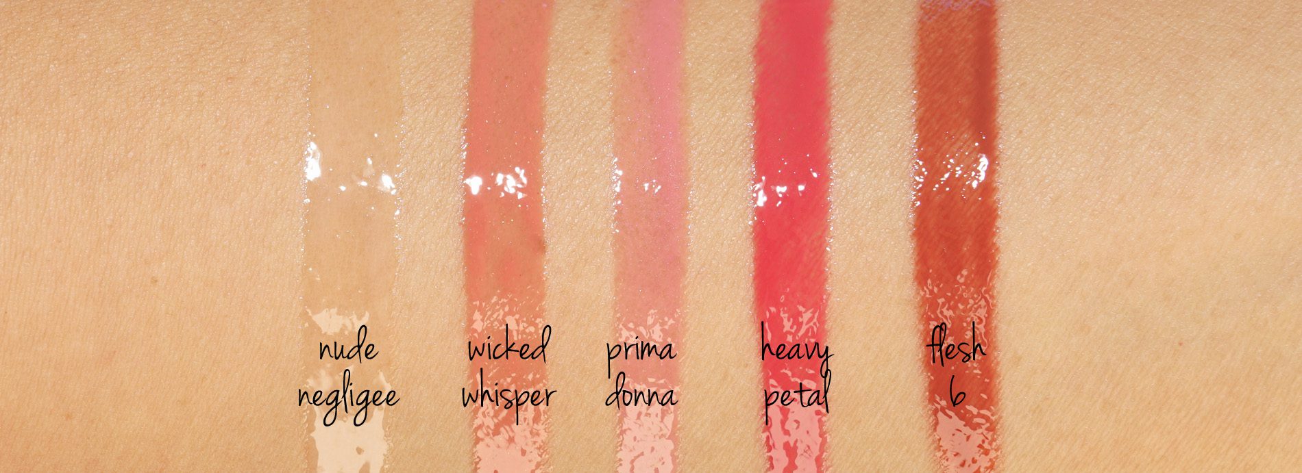 I fit as many swatch comparisons as I could on my arm to the other LUST Glosses I own. I swatched the neutral lighter shades side by side: