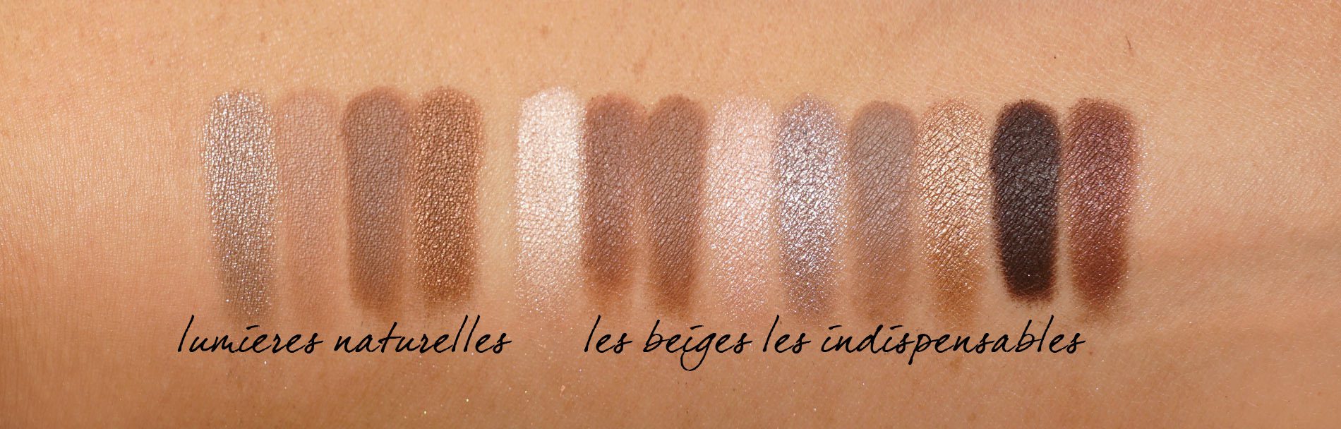 The Les 4 Ombres in Lumieres Naturelles has smooth blendable textures with medium pigment. There is a sparkling silvery taupe, a matte soft light cool brown, a matte medium brown and a soft shimmering satiny bronze. It pulls like a true neutral on my eyes and the silvery taupe makes it more on the neutral-cool side. By comparison the Les Beiges Les Indispensables has more shimmery options and pulls a little warmer and has a wider range of options from light to deep.