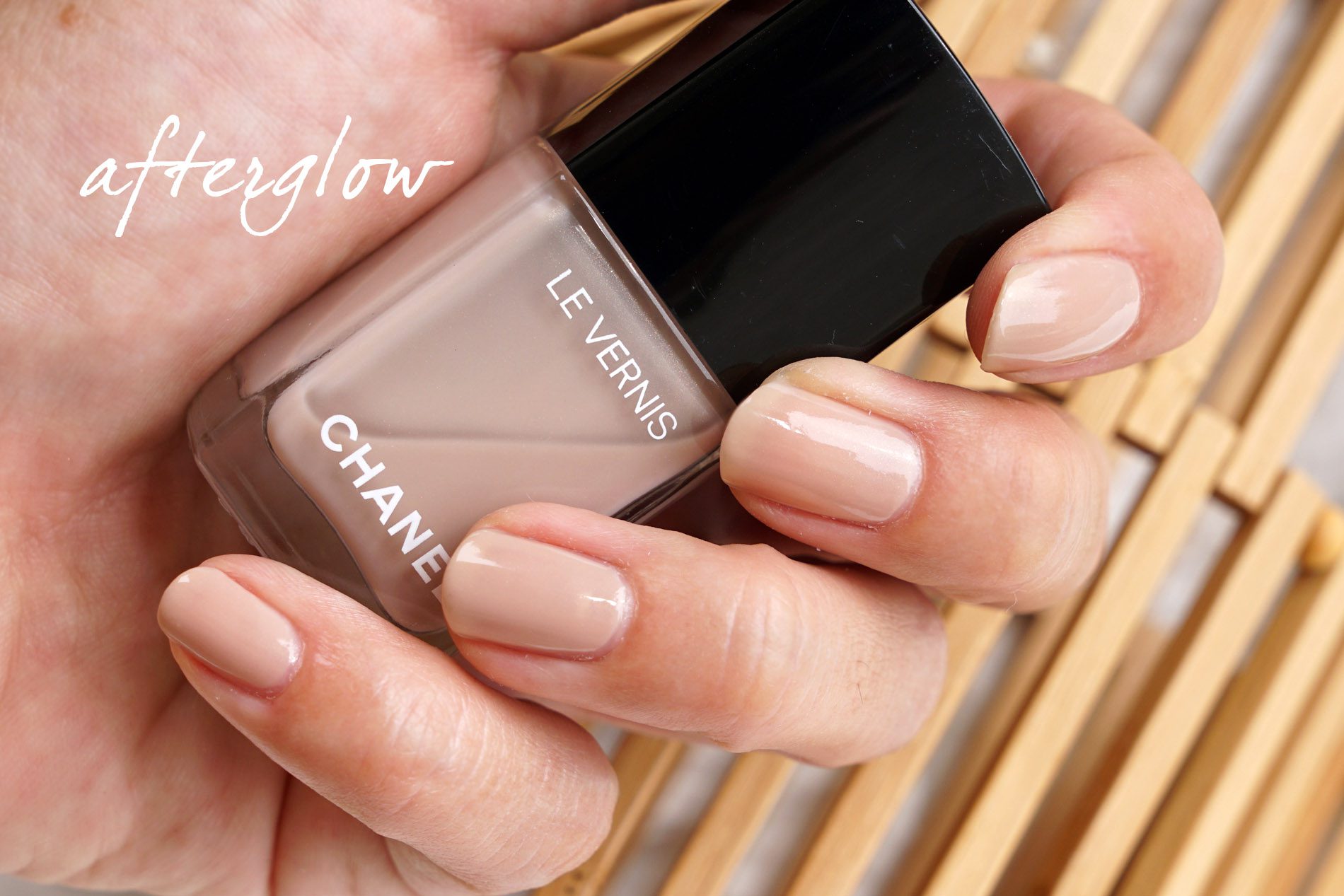 Afterglow is a sheer neutral nude that has that secret Chanel shimmer in the bottle. On the nails there’s not really any visible shimmer. This is a sheer color so two coats will give you a barely there polish. If I add three I get a clean barely there look. Below is with three coats.