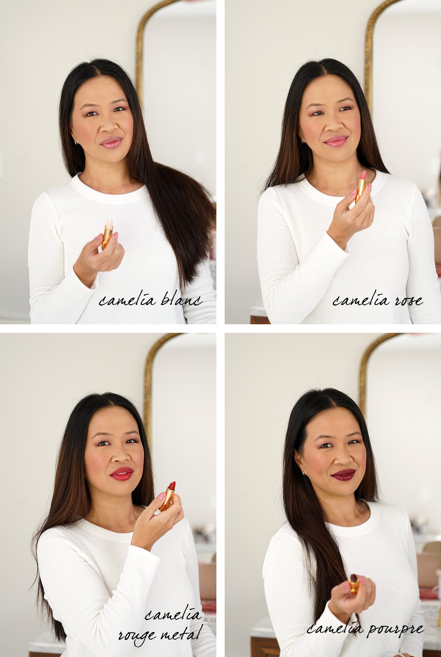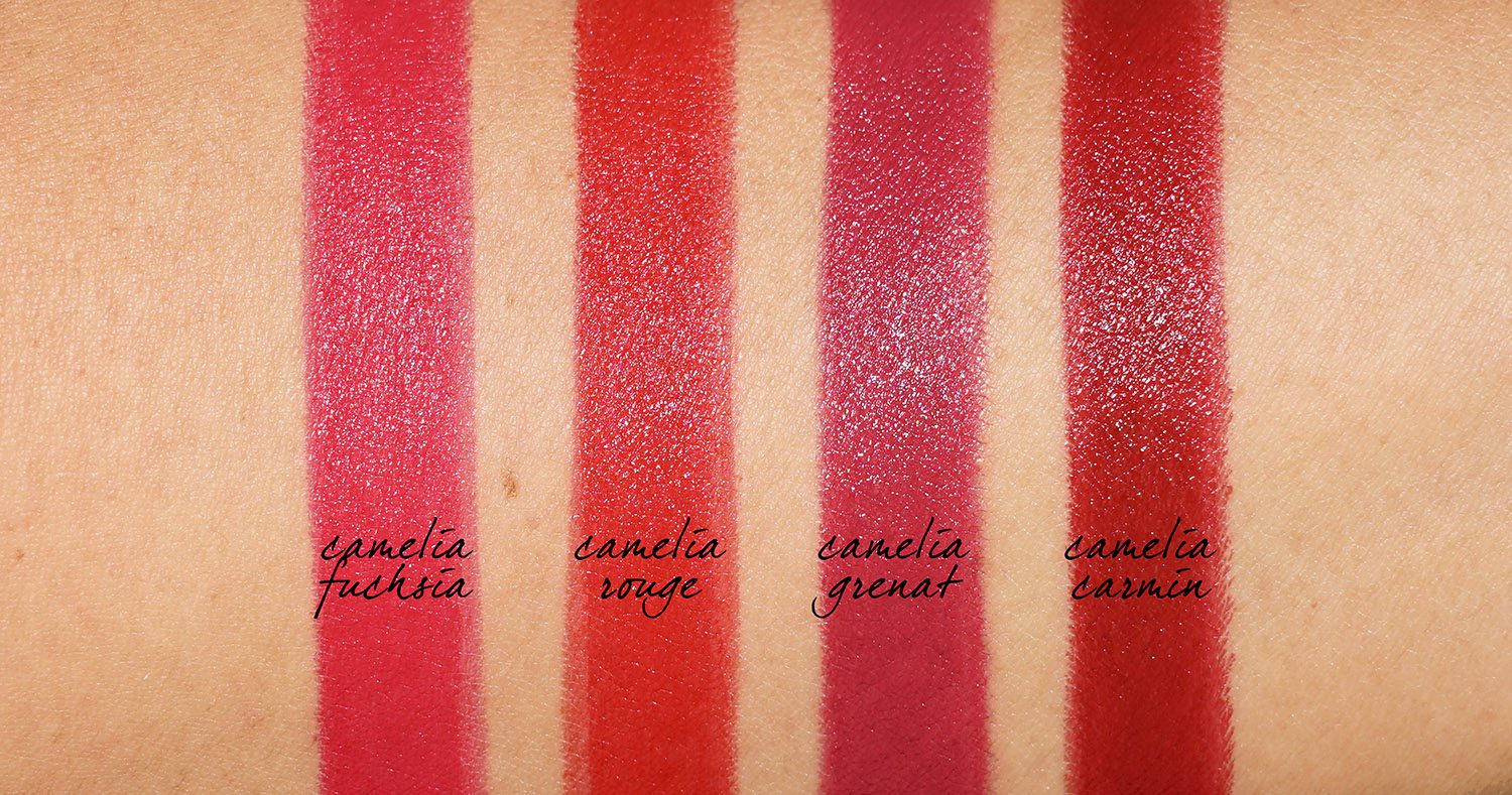 - All four Chanel Rouge Allure Camelia Lipsticks swatched on bare lips