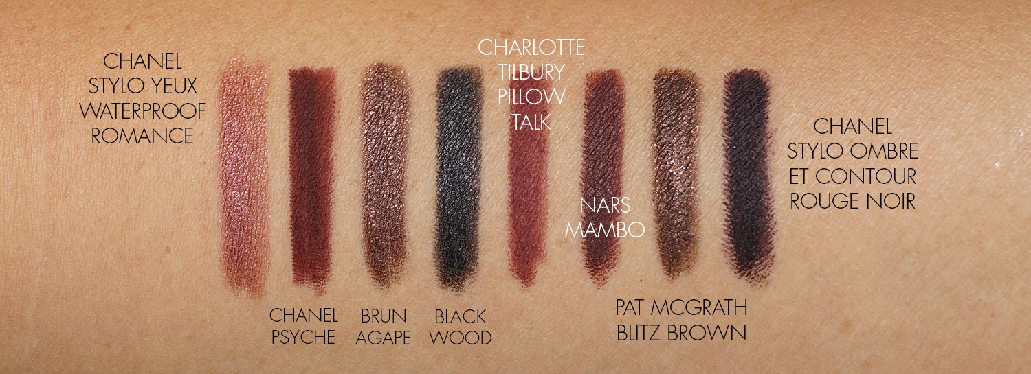 There are two new Stylo Yeux Waterproof Long-Lasting Eyeliners this season. Romance is a shimmery soft mauve-pink (I think I want to try this as a lip liner!) and Psyche is a matte plum brown. I swatched these next to a few other liners for color reference. The Stylo Yeux Waterproof this season are smooth and pigmented. Psyche is a deep color that is a nice alternative to black or brown.