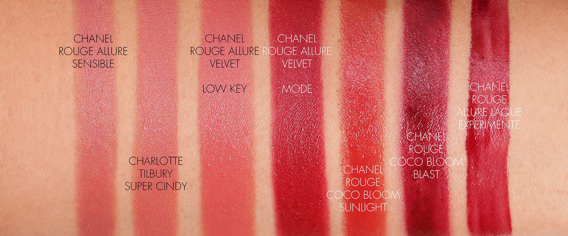 Last is a look at the two new Rouge Allure Velvets ($40 each). Shade 74 Low Key is a warm pink (similar warmer/deeper option to Charlotte Tilbury Super Cindy) and 75 Mode is a classic bold warm red. This is a “velvet” formula but it’s a luminous matte with smooth flawless coverage. A few swatch comparisons below.
