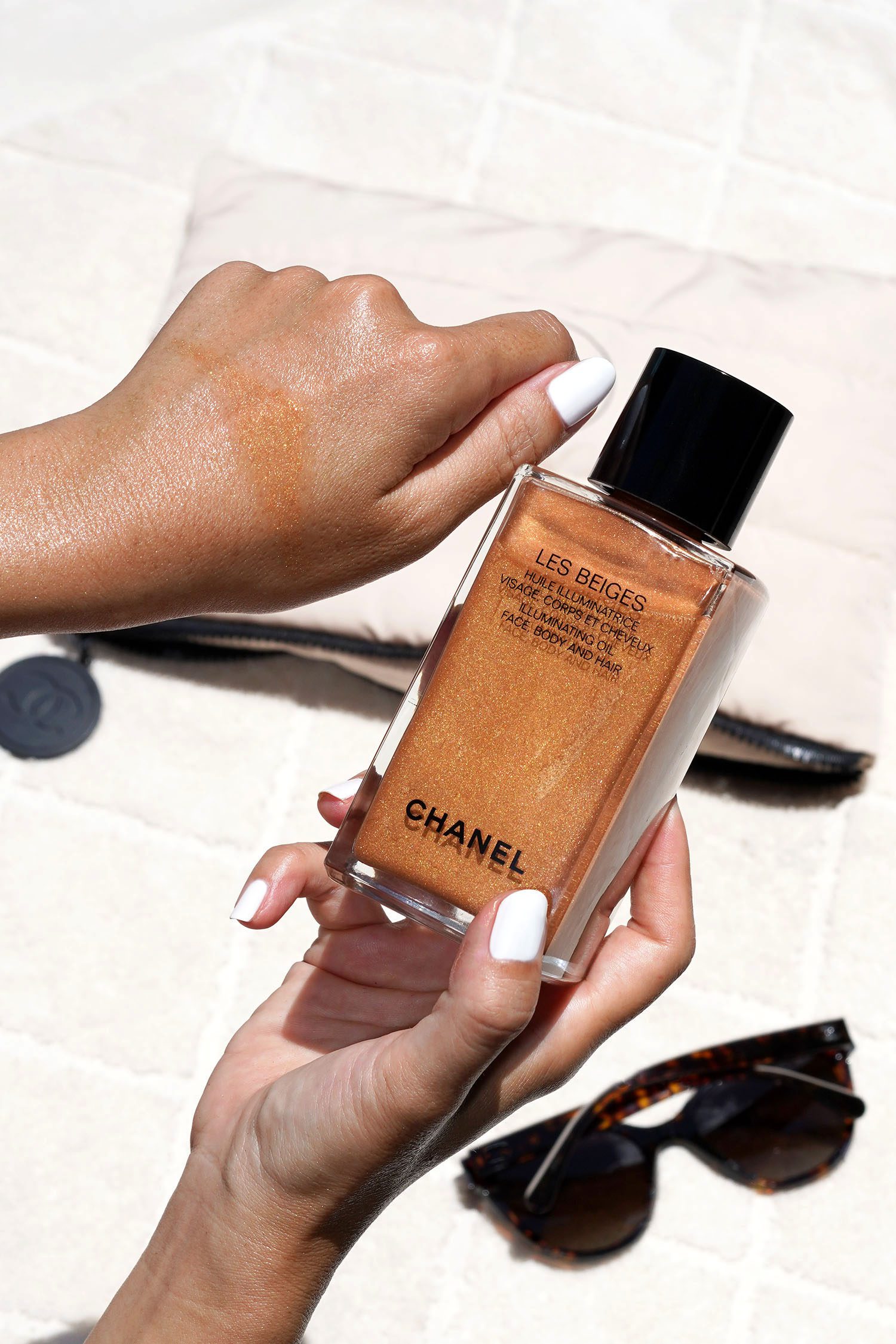 The Les Beiges Illuminating Oil is a multi-use dry oil for the face, body and hair. It has a clear base with golden shimmer suspended inside. Once you shake the bottle the shimmer floats inside. The oil has a subtle scent similar to the Les Beiges powders. The shimmer is hard to see unless direct sunlight or lights hit the skin. Once the light catches the shimmer you can see the skin has a subtle sun-kissed glow.