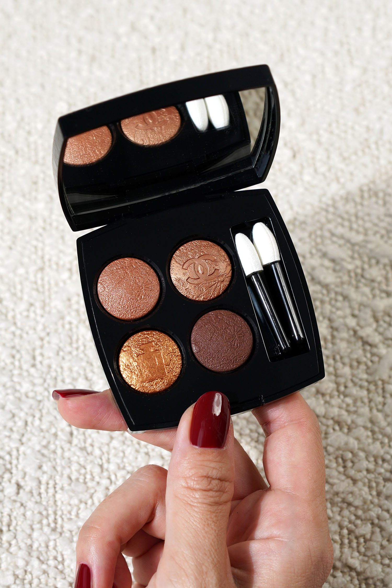Chanel launched one eyeshadow quad in the Les 4 Ombres ($65) 937 Ombres de Lune. This one also pulls very warm with a multi-dimensional copper rose shimmer, neutral tan beige shimmer, sparkling warm yellow gold and a satin medium brown. Pigment is beautiful and easy to build and layer. The overall color theme pulls a lot warmer than I’m used to wearing but once you add liner and smoke out the dark brown shade it comes together in a warm holiday look. I love the embossed detailing on all the items. Chanel always adds those extra touches that make their products beautiful and special.