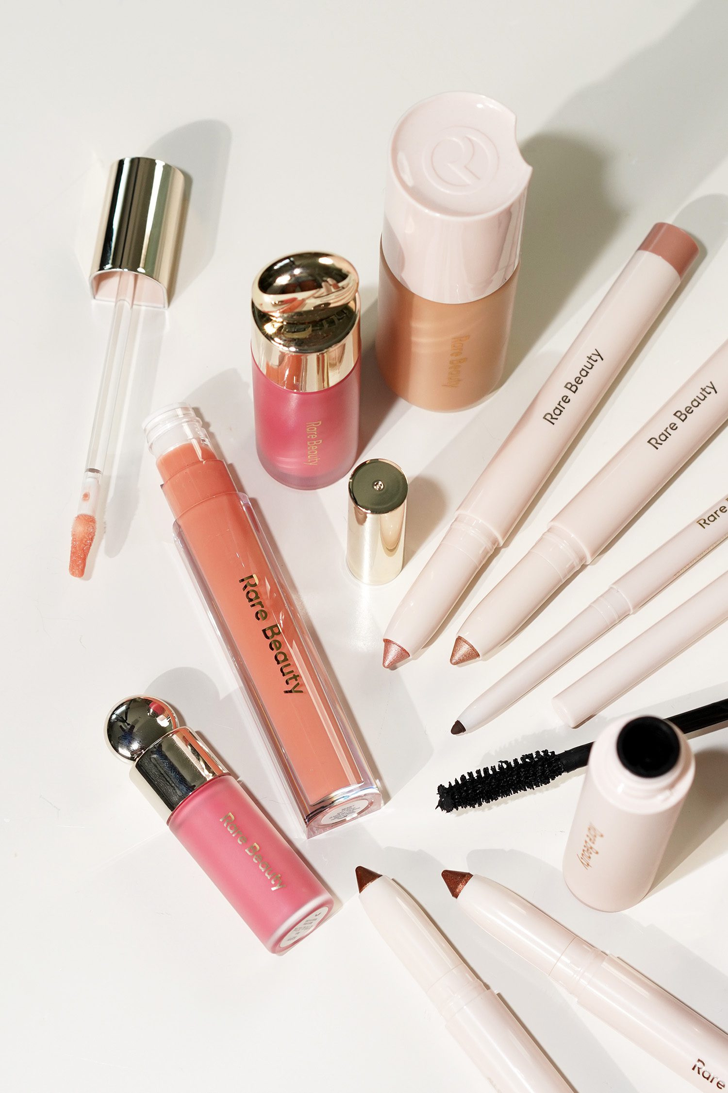 - Lips – Rare Beauty Kind Words Lip Liner + Lipstick in Humble + Gloss in Nearly Petal