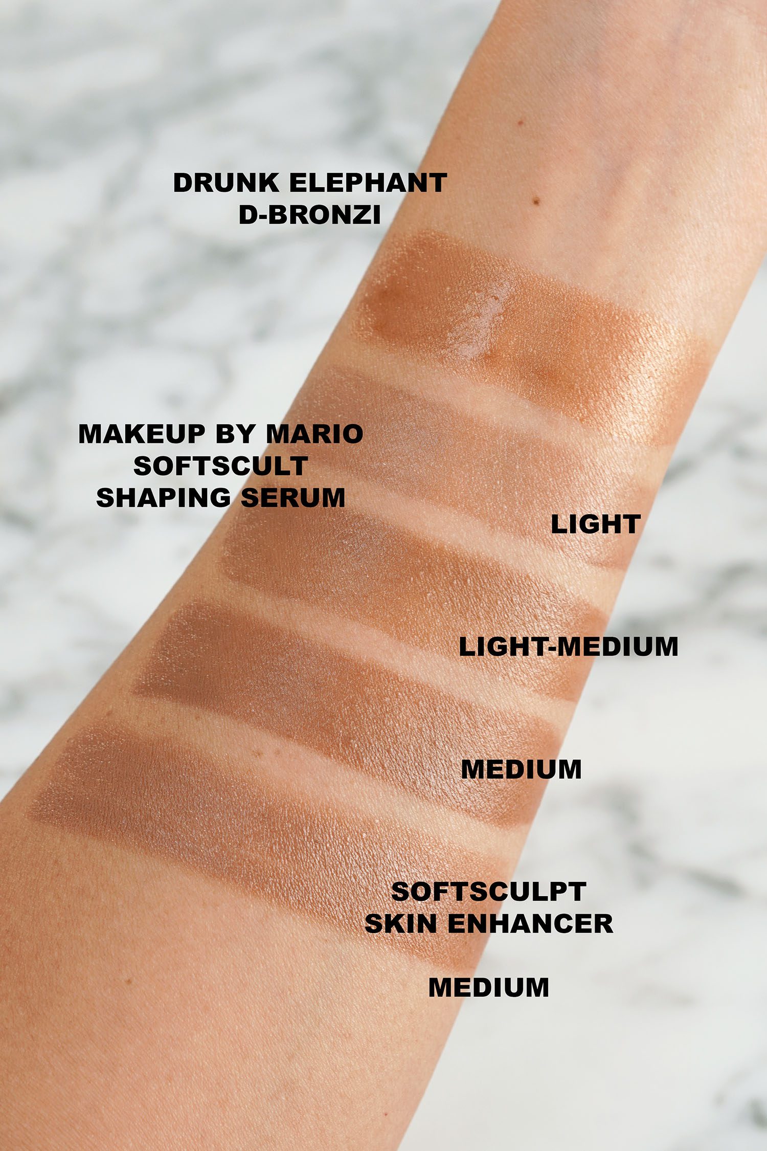 I really like the look of the new Bronzing Serum, but I’m not sure I’m quite hooked. I love the packaging style. It has a pump to dispense product but if you twist off the lid there’s also a sponge tip applicator to use. It has a similar effect to the Drunk Elephant D-Bronzi Drops but the Makeup By Mario has a slightly thicker more emollient finish. I’ve added swatches to compare the undertone.