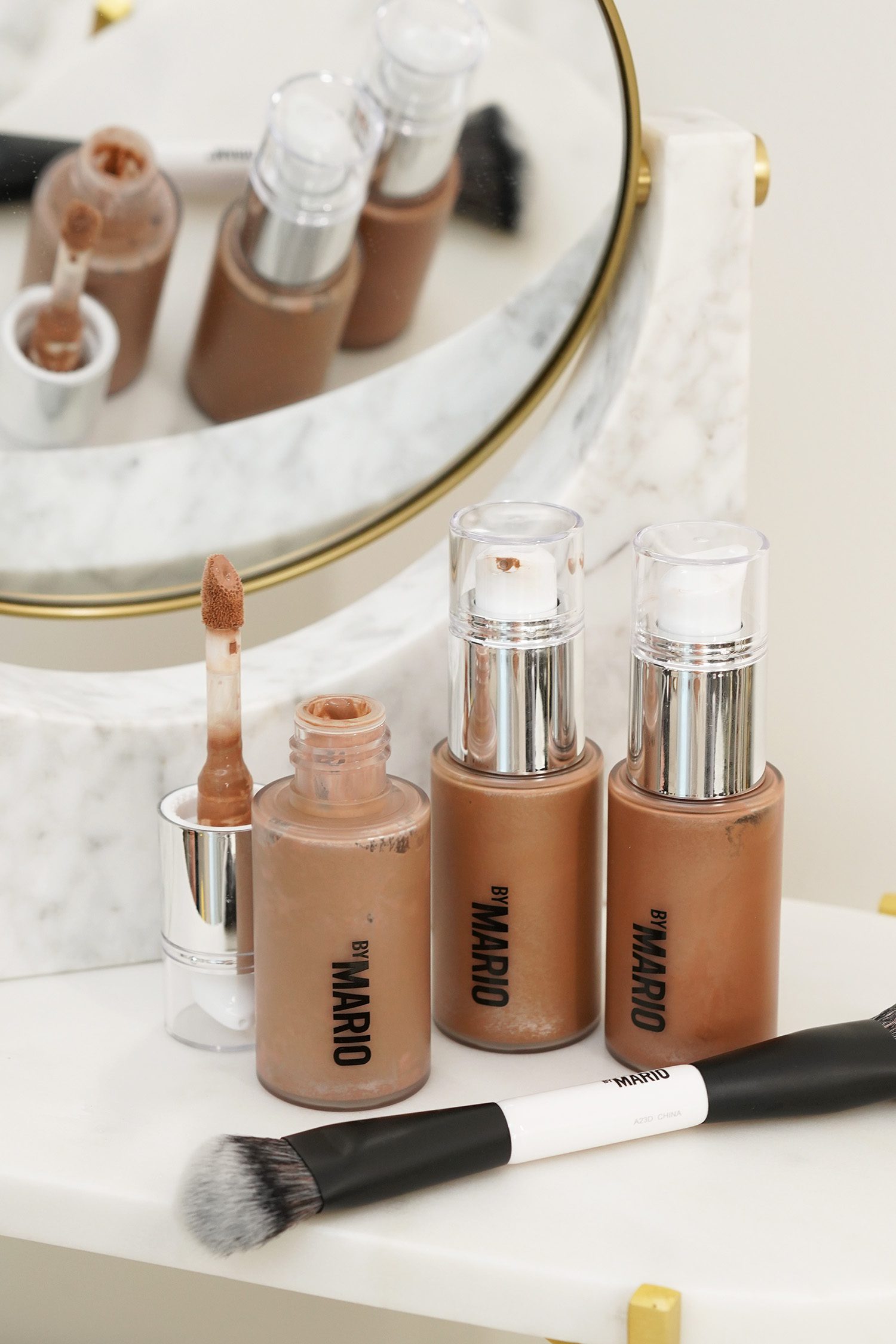 Makeup By Mario launched a new SoftSculpt Bronzing Shaping Serum and it took me a few tries to figure out how best to use it. As a liquid bronzer on top of foundation I found it a little too sheer but it does give the skin a very natural looking sunkissed glow. I like mixing it in with foundation to add warmth or using it as a base to warm up/tan the skin – kind of like a self tanner drop for the face. It is on the emollient side so I don’t know how those with oily skin will like it (I think it will be too dewy). There’s a new Double-Ended brush launched for this product and it’s a nice one to work with the liquid.