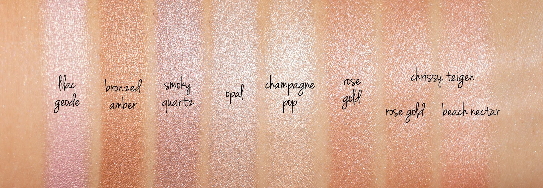 Swatch comparisons next to Rose Quartz, Lilac Geode, Bobbi Brown Highlighting Powders in Opal, Tawny Glow and Afternoon Glow. The Becca pulls more blue/cool toned on my face while the ones from Bobbi Brown are more on the neutral side.