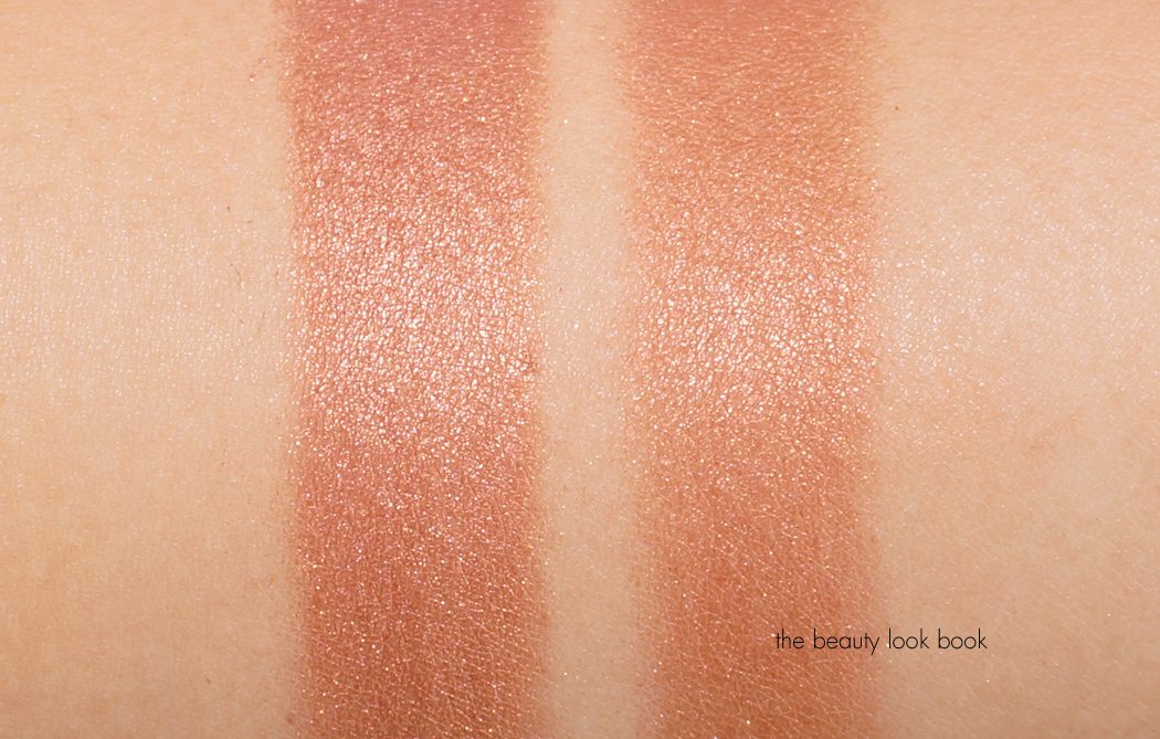 Swatched below with a medium hand, you can blend to sheer out or apply with a denser brush for more intensity. Pigment is so rich I suspect these colors will show up on a wide range of skin tones. The overall effect is very glowy but still wearable for conservative makeup lovers: