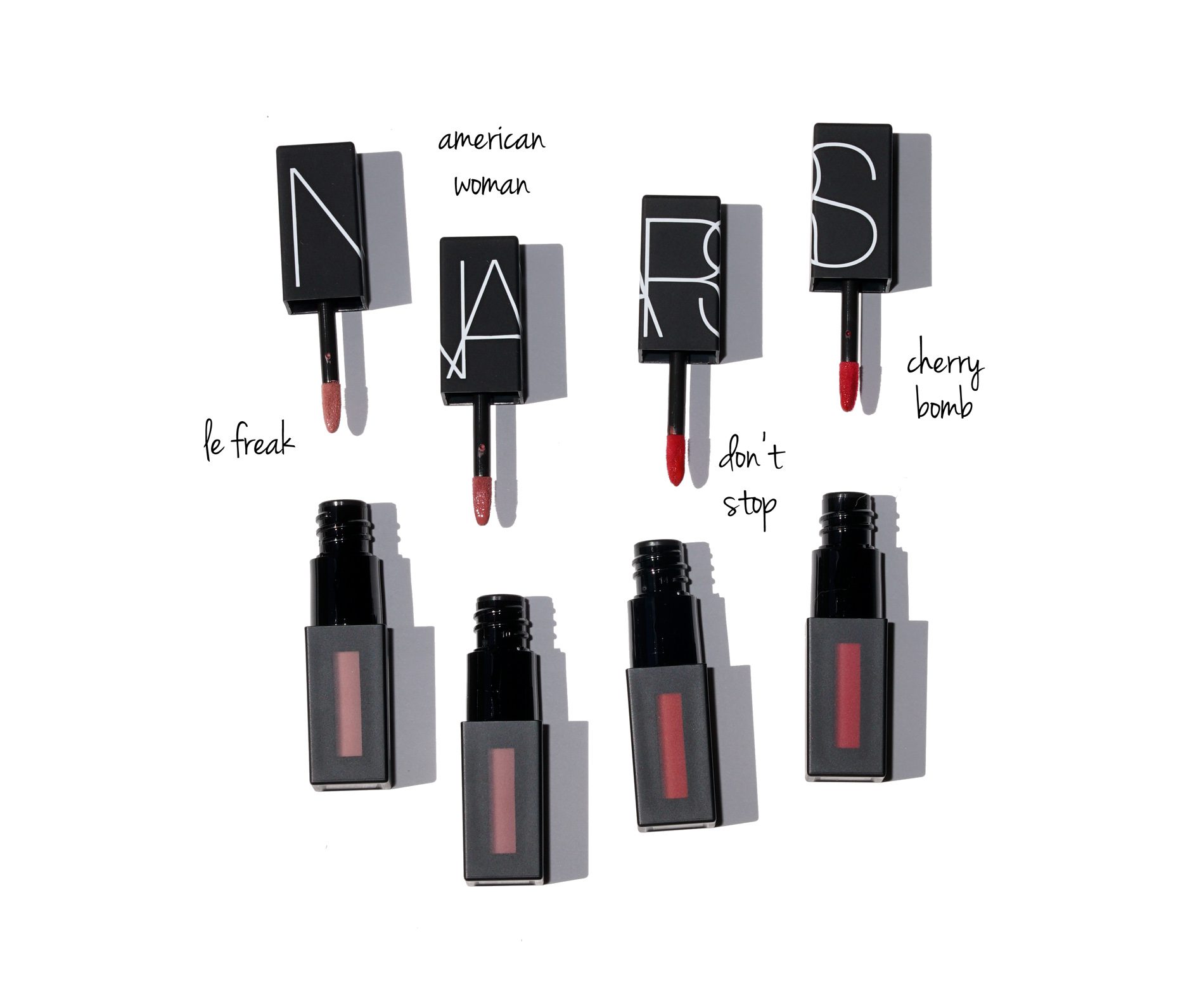 New lips just launched from NARS in a few different formulas and today I’ve swatches of all the new NARS Full Vinyl Lip Lacquer ($26 each for 0.17 oz/5.5 ml, currently available at NARS and Barneys New York). There are 10 shades in this formula and 1 special-edition color Orgasm (reviewed here). In addition there are 5 new colors of the Velvet Lip Glide (reviewed here) and 5 new shades of the Powermatte Lip Pigment (to be reviewed soon). The NARS Full Vinyl Lip Lacquer is an opaque, rich color, full coverage gloss with a high shine. They come with a flat applicator with a sponge tip on one side and plastic portion on the other. One will dispense a lot of color while the other blends it out more. There are 10 shades total, 6 creams and 4 sparkles. I believe there are hits and misses with this launch formula-wise.