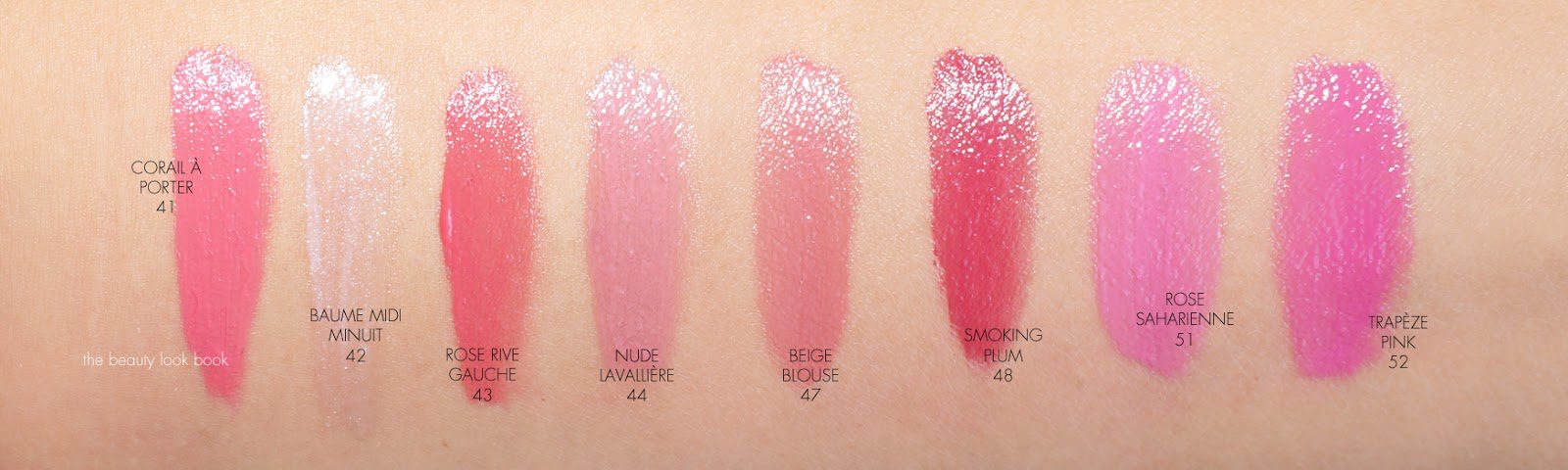 For the new shades of Rouge Volupte Shine there is a good mix of neutrals and modern bolds. The formula melts into the lips flawlessly with a lightweight veil of hydration. Color is sheer-medium but buildable with the prettiest shine. They make the lips glow! You can create a day or night look with the colors: