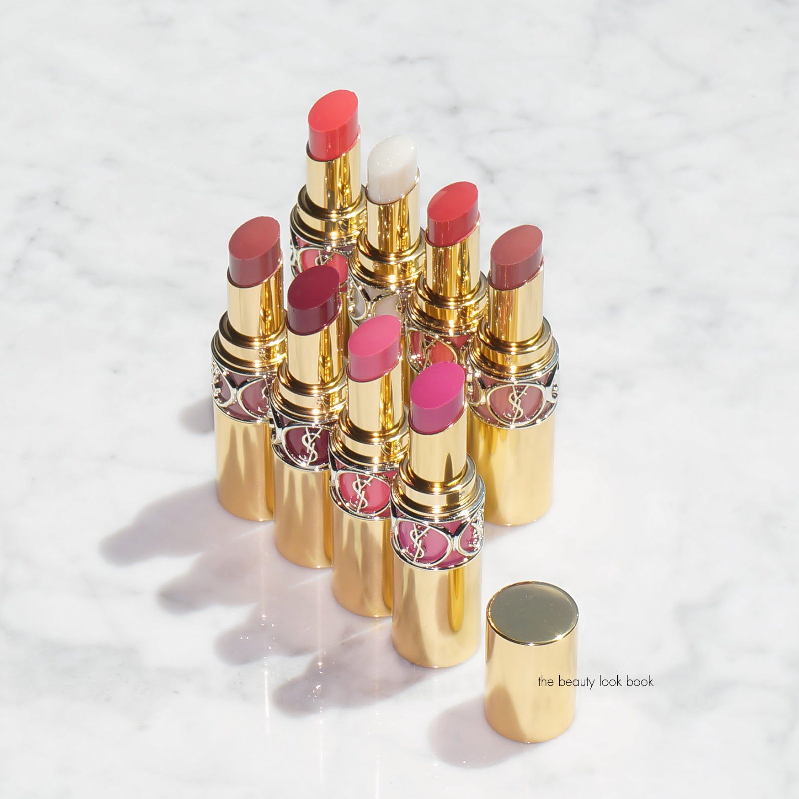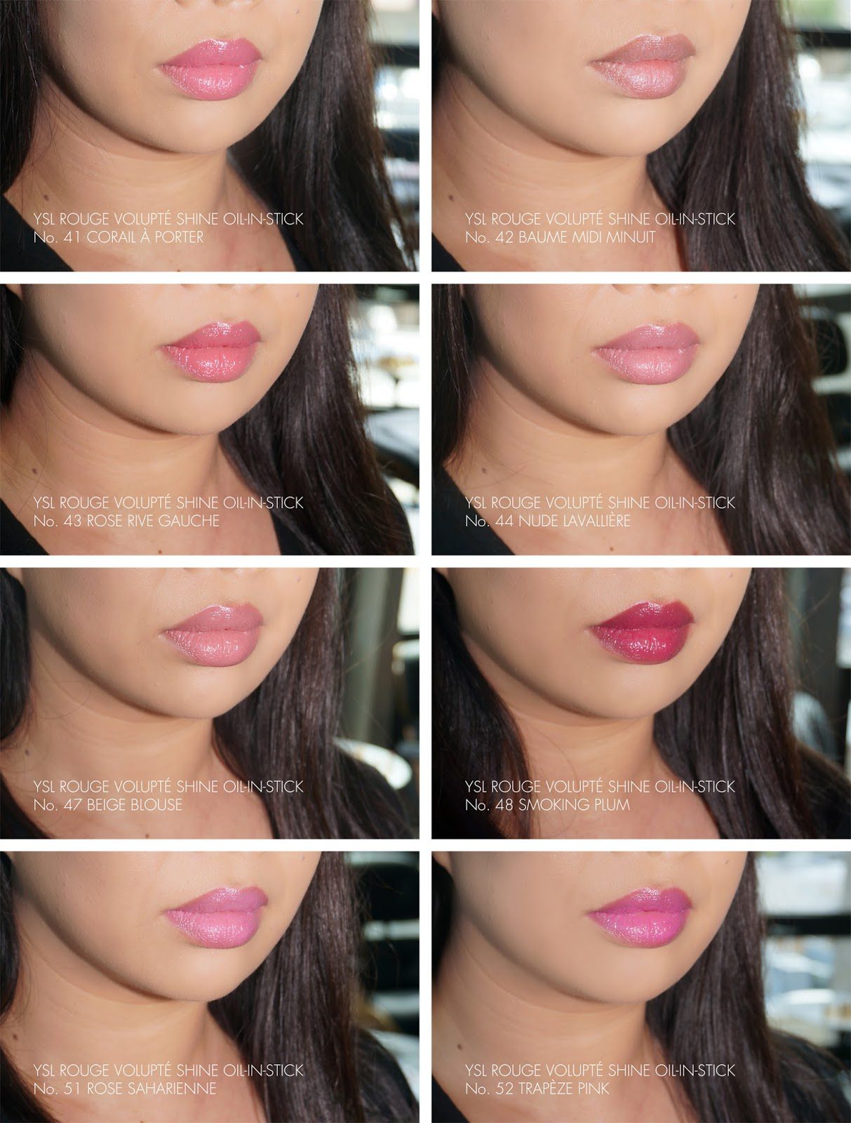 There are eight shades that I picked up. When I bought mine I ordered them sight unseen. I will say that the online swatches were hit or miss. Some were completely different from what I envisioned but luckily all of them are very wearable. Out of all the sheer glossy lipstick formulas my top two favorites are the Chanel Rouge Coco Shines and YSL Rouge Volupté Shines. The new Rouge Volupté Shine Oil-In-Sticks are super hydrating and add a lush coat of moisture on the lips while adding a nice tint of color. They have noticeable coverage even though the pigment is sheerer than an opaque formula. You can layer for more color but at the end of the day they are still a medium-sheer coverage lipstick. If you like the moisturizing feel, shine and color but want more pigment and coverage I highly recommend you check out the Chanel Rouge Coco Stylos instead (all swatched here).