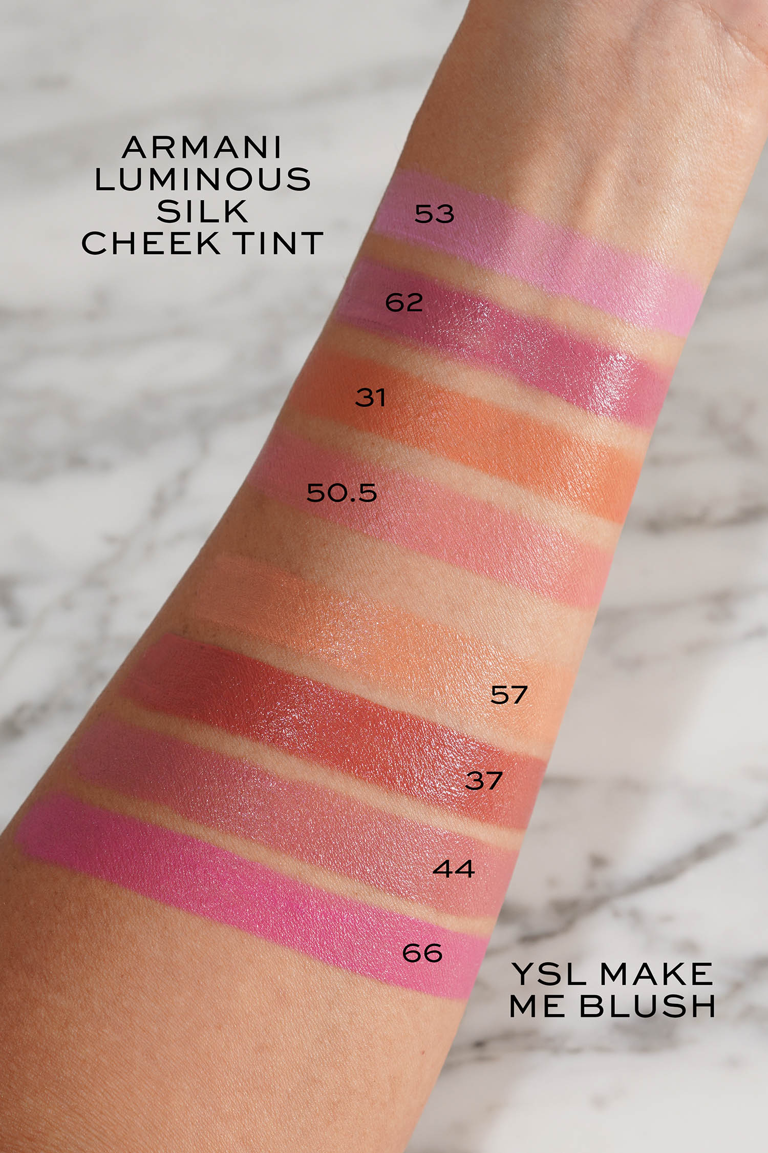 There are two finishes matte and satin and I love them both. These blushes have a similar soft texture to the Gucci Luminous Matte Beauty Blushes (swatches here and here) in the sense they are soft, easy to blend and layer beautifully, but I find the pigment in the YSL formula to be better – they are really easy to build and layer.