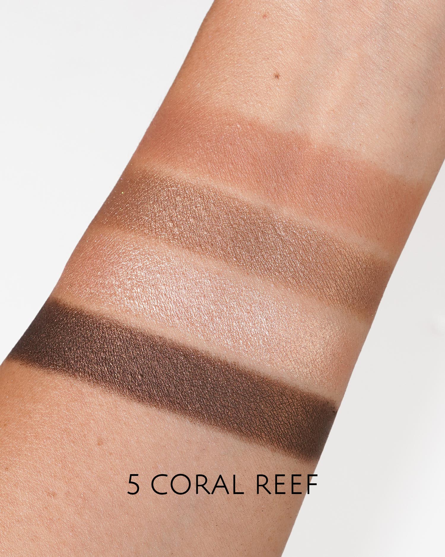 Coral Reef 5 is the most natural on my skin as the tones match my skin tone the closest. The shades pull more satiny matte than the other quads.