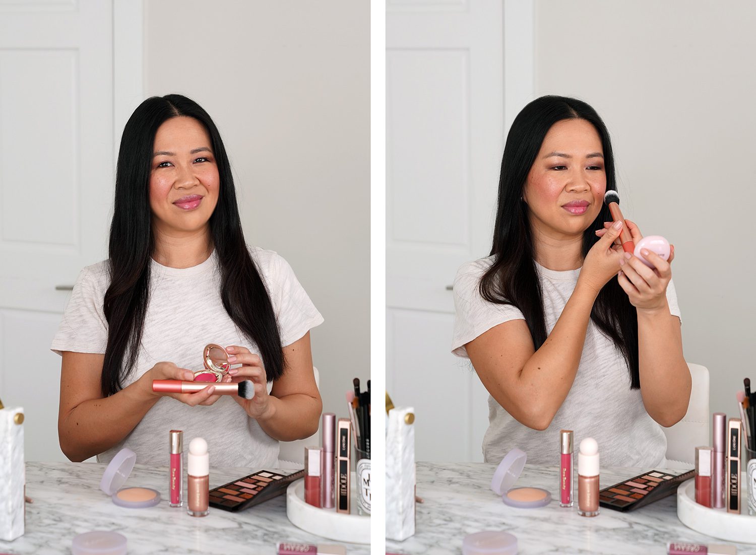 Makeup looks wearing MAC Studio Fix Tech in NC35, Gucci Pressed Powder in Shade 5, Anastasia Beverly Hills Brow Wiz in Medium Brown, Bobbi Brown Eyeshadow Palette in Golden Nudes, Laura Mercier Blush in Fresco + Bellini.