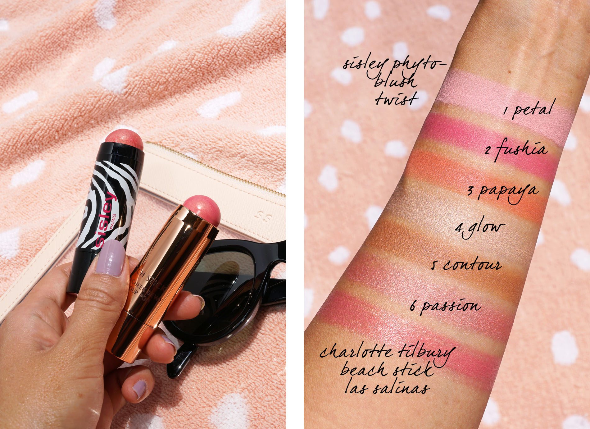 The Sisley Phyto-Blush Twists* have been a favorite for a cream to powder product for a couple years now. They launched two more colors sometime last year and it took me forever to try them but the two new ones are the best ones. Shade 5 Contour can double as a bronzer and Shade 6 Passion is the prettiest coral pink gold. I bought one of the Charlotte Tilbury Beach Sticks for a sheer glow. I had a few several years ago but gave them away in a beauty purge before during our cross-country move. I think Las Salinas is the prettiest pink with gold shimmer. Above I swatched with a heavy hand but all of these blend out for a sheerer wash of color.