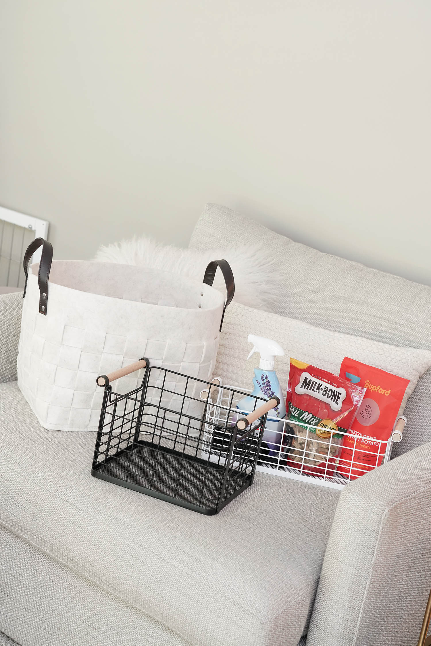 To keep his toy situation under control I bought a couple Woven Felt Baskets (available in Large and Small sizes) and Rectangular Wire Baskets (available in multiple sizes and in black or white) from Target. I liked them so much I bought a few more for around the home.