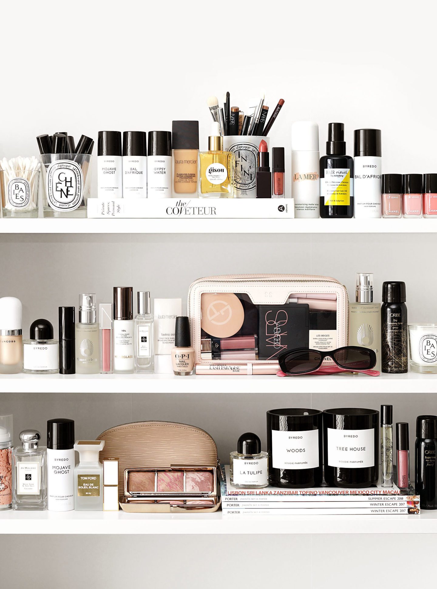 Bottom shelf: Jo Malone Wood Sage and Sea Salt, Byredo Mojave Ghost Hair Perfume, Tom Ford Eau de Soleil Blanc, Tom Ford Lip Color Sheer Nudiste, Hourglass Ambient Lighting Blush Palette, Byredo La Tulipe, Byredo Woods and Tree House Candles, Diptyque Do Son Perfume (from a limited-edition fragrance set), MAC All Things Magical Lipglass, Oribe Superfine Hair Spray