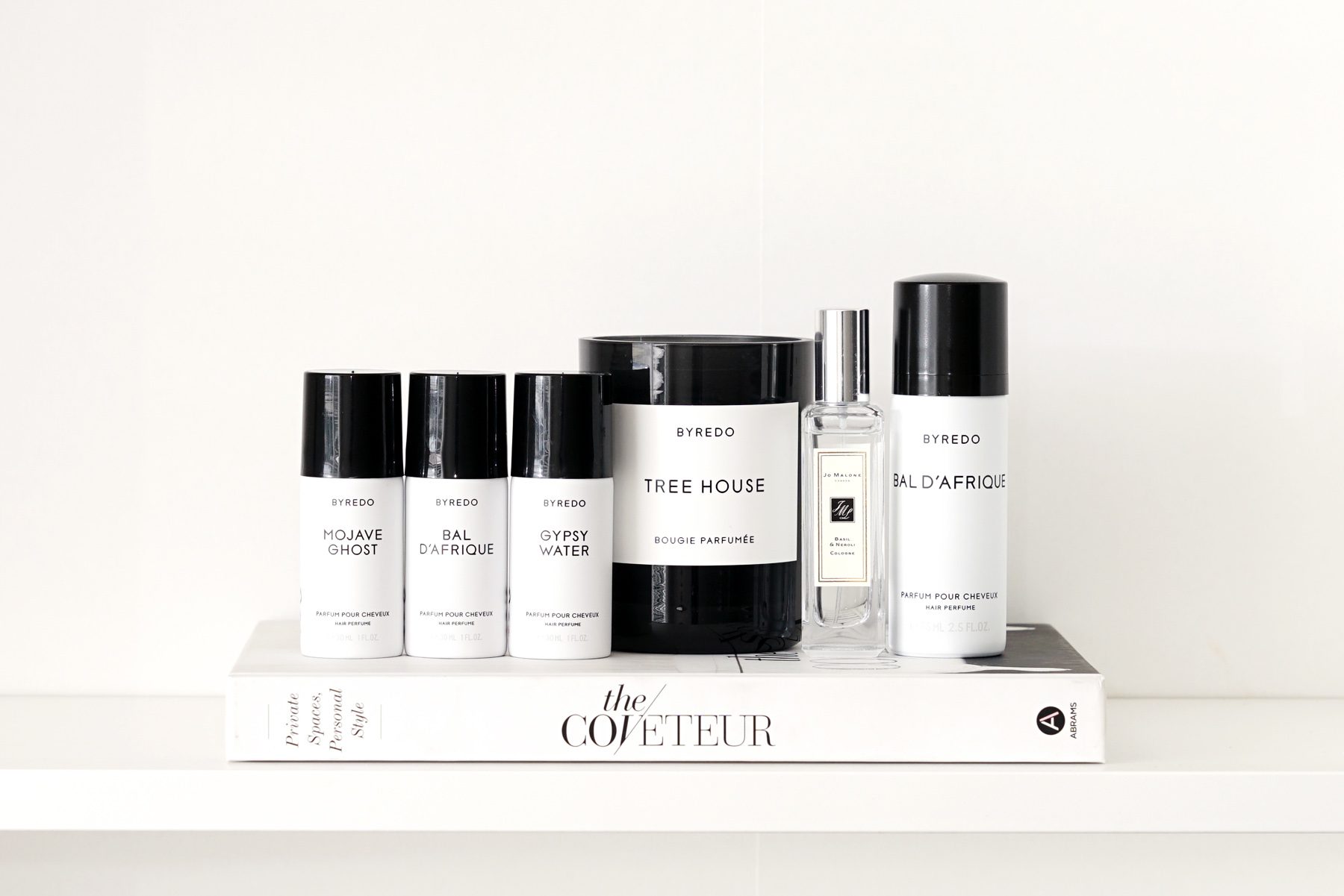 Full shelf features listed below, press samples indicated with a * top shelf: Diptyque Baies small candle recycled, Diptyque Chene candle, Byredo Triplé Gannant Bois Hair Perfume Trio, Laura Mercier Flawless Fusion Foundation in Buff, Gisou Honey Infused Hair Oil (travel size)*, Diptyque Infini Candle (discontinued), Laura Mercier Nude Lip Trio, La Mer Moisturizing Matte Lotion, Sisley Hair Rituel Hair Oil*, Byredo Bal D’Afrique Hair Perfume, Chanel Le Vernis in Organdi, Nuvola Rosa and Halo