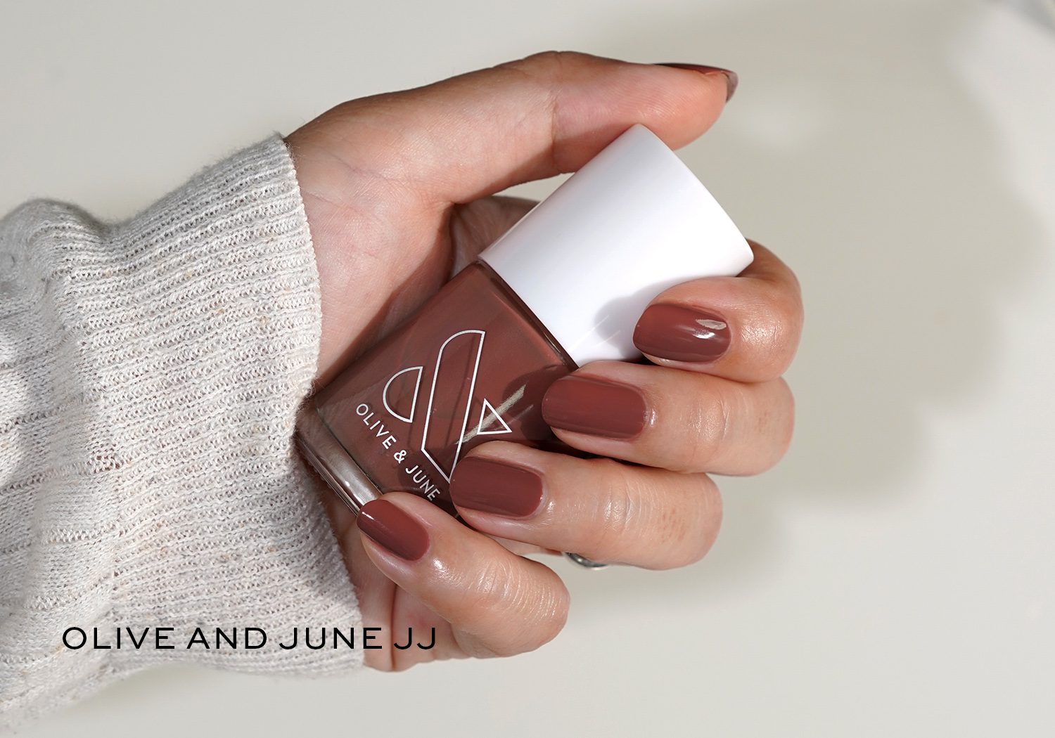 Olive and June JJ is the prettiest warm chocolate milk shade, neutral-warm on me. This is with two coats.