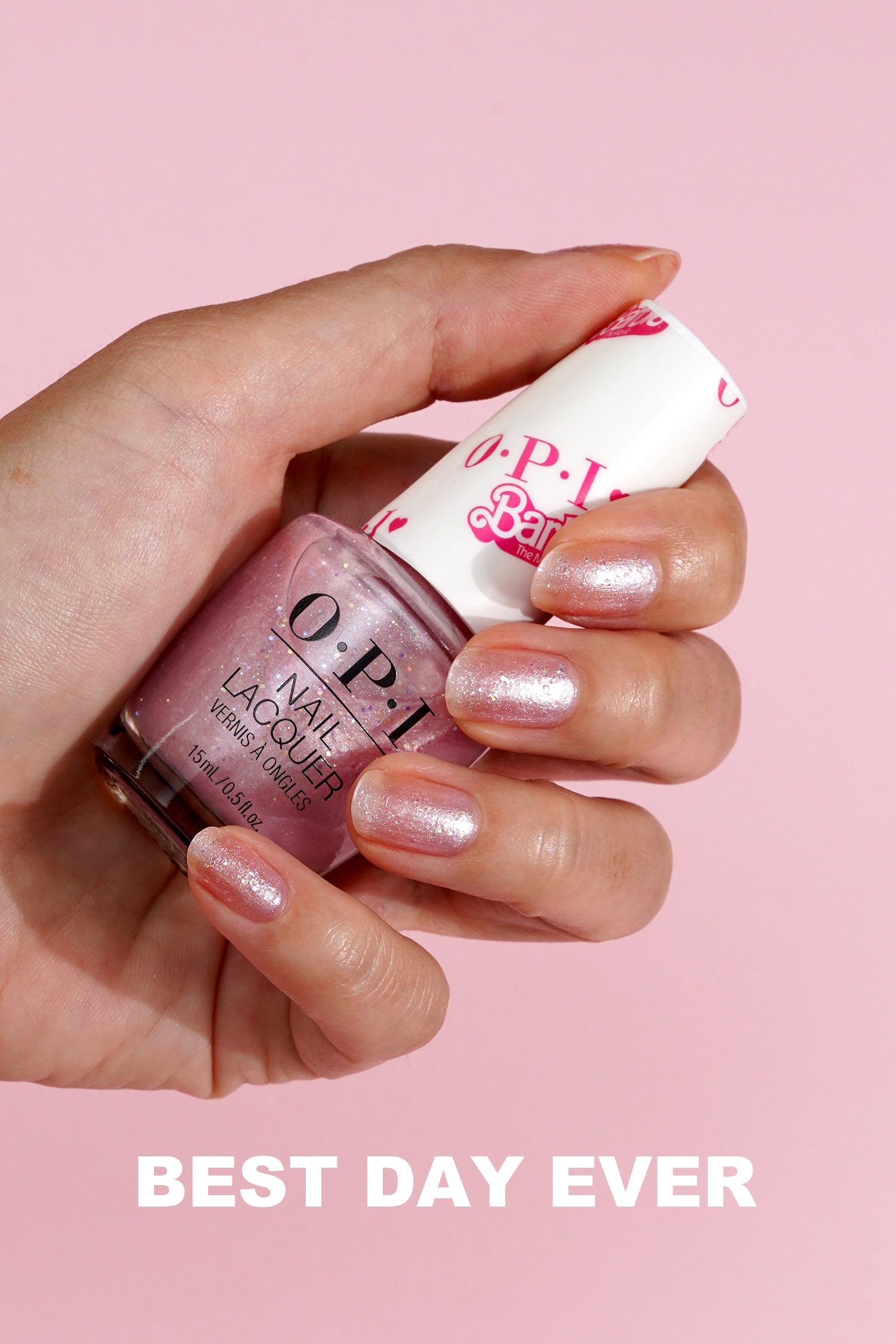 Best Day Ever is a pale frosted pink shimmer base with different colors of glitter suspended throughout. I think this one is really fun.