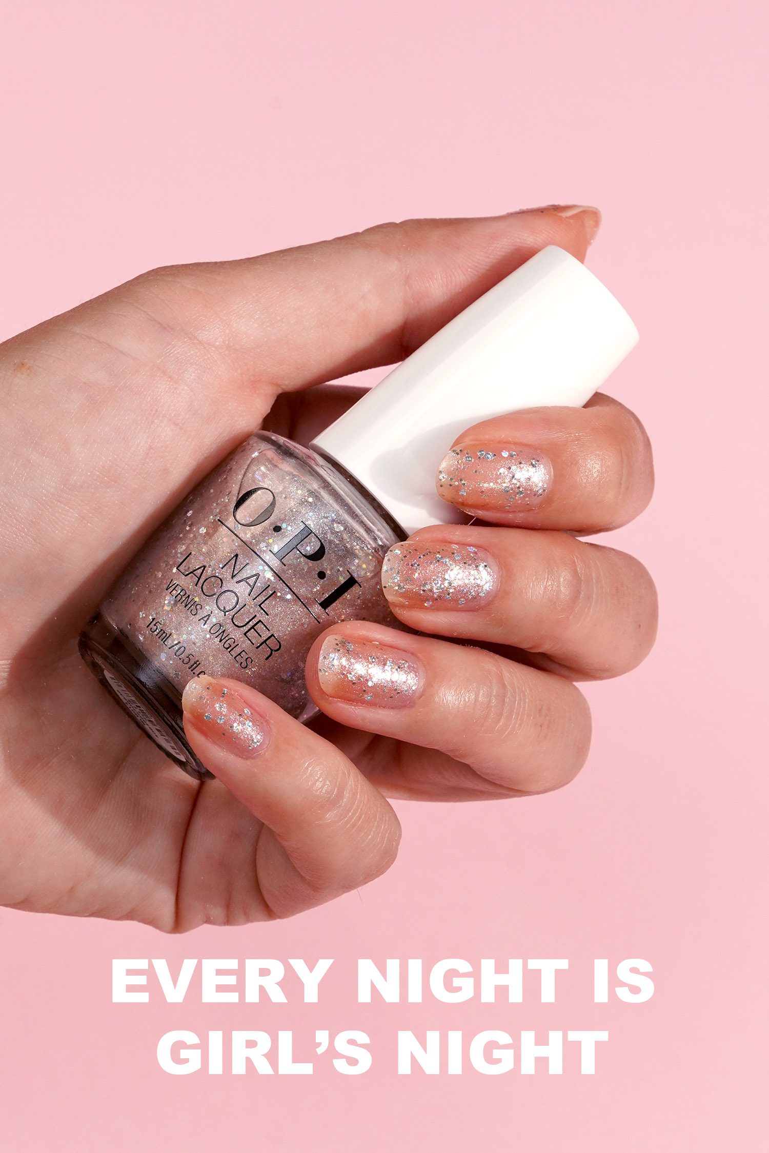 Every Night is Girls Night is a chunky glitter with a sheer shimmery base. The base is almost clear. Glitter is very dense in the polish so you only need 1 coat to cover the entire nail, but I applied it with 2 below.