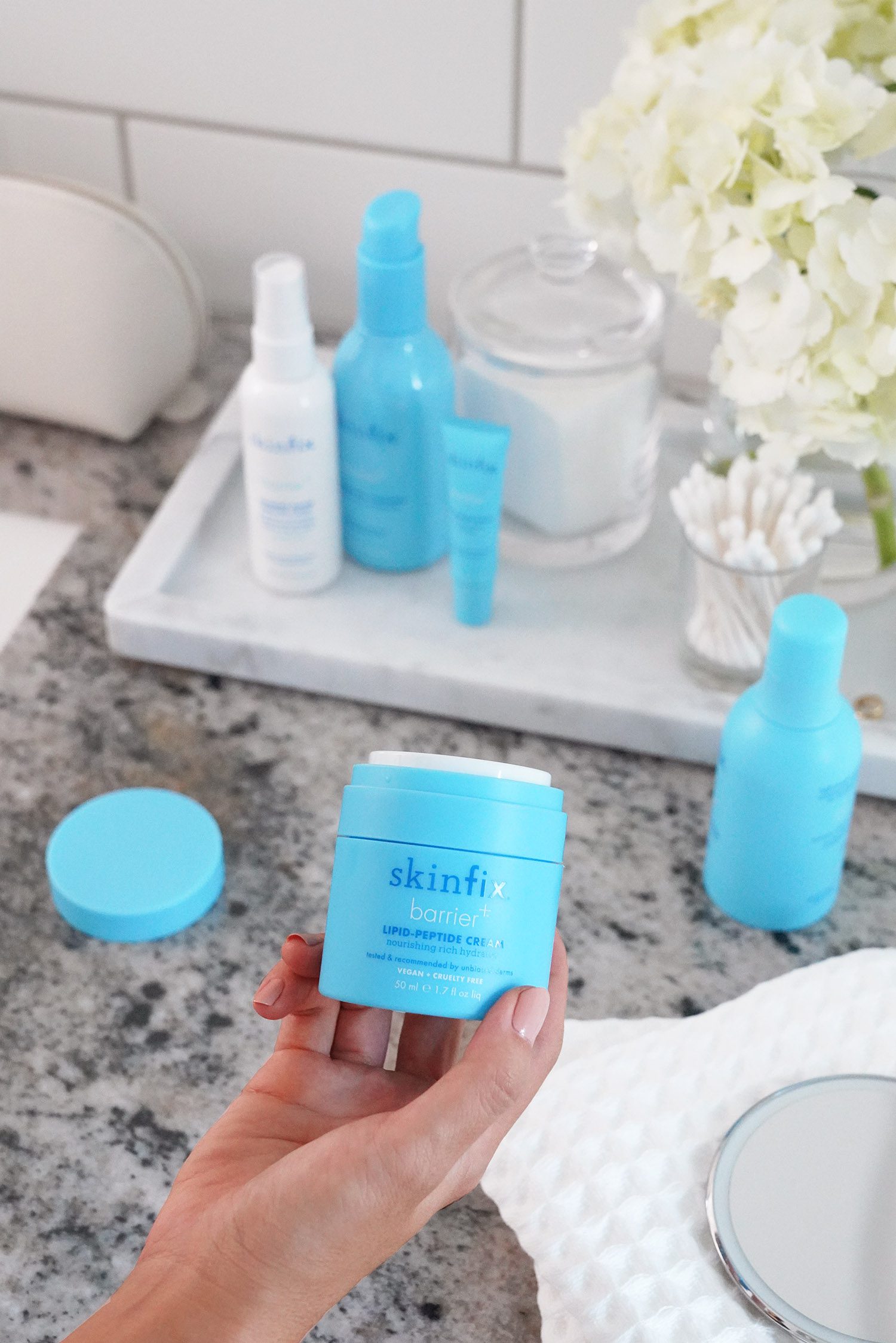 small round marble tray from Goop, makeup bag is Cuyana