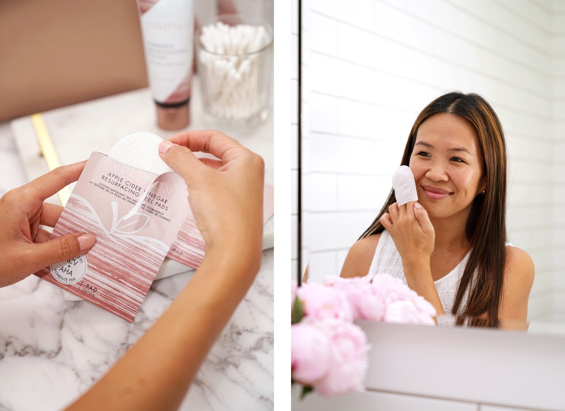 Last but not least are the Apple Cider Vinegar Resurfacing Peel Pads which are amazing! The Best of Volition Kit comes with 3 or you can also buy 3 separately in their Try-Me Pack. (Also available in a 30 pack). I’ve been reading about incorporating apple cider vinegar into one’s skin care routine as a toner to reduce breakouts and inflammation but wasn’t keen on the idea of applying it straight from the bottle or the potent smell. The Volition ACV Resurfacing Pads are the perfect alternative and they also contain AHAs, Lemon and Orange Extract to remove dead skin, Witch Hazel to remove dirt and excess oil that may still be on the skin even after washing, and Glycolic Acid. The first time I used it I only applied on half my face to see how much of a difference there would be – there was a noticeable difference by morning! These do have an apple cider vinegar scent to the pads but it’s not as overpowering as I anticipated and it dissipates after a few minutes. I do have sensitive skin but these had a very moderate and gentle tingle. Quick note that I haven’t used any other acids, peels, retinols or vitamin C products on my face in a few weeks now so if you have those in your routine your skin may be extra sensitized and you’ll find the tingle a little more intense.