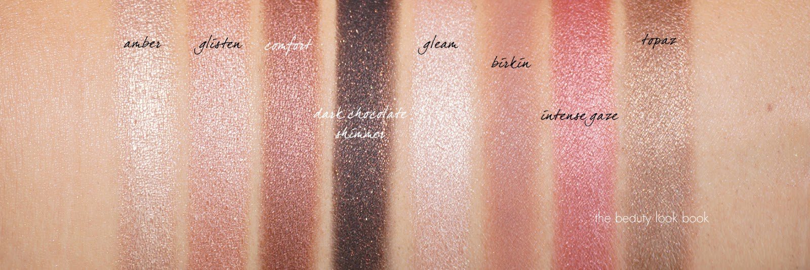Bottom right quad: Amber, Glisten, Comfort, Dark Chocolate Shimmer