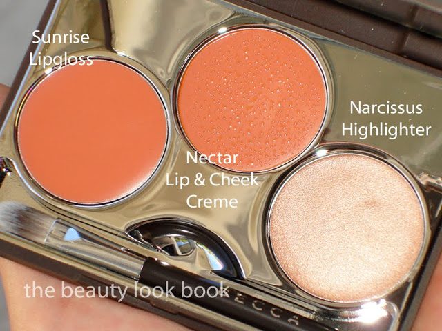 Fallen Angel Palette is for lips and cheeks. It appears to have more of a peachy-resort feel rather than angelic. When I think “angel” I think soft pink and champagne. Still this is lovely. Sunrise is a sheer peach (almost clear), Nectar reminds me of Tuberose Lip & Cheek Creme, Narcissus is a pale gold cream highlighter.
