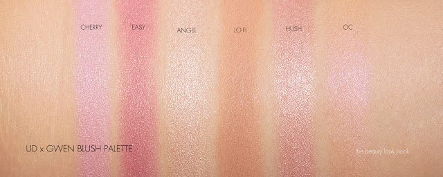 Up first is the UD x Gwen Blush Palette. This comes in a medium-sized mirrored compact similar in style to the UD x Gwen Stefani Eyeshadow Palette. The packaging is very sturdy and well made. The colors have medium but buildable pigment and the texture is very soft and smooth. There is quite a bit of powder kick-up when I dip my brush into the powders but it’s easy to clean up and once the product is on the face there isn’t any fall out. Cherry is a soft cool matte pink, Easy is a medium rose with gold shimmer, Angel is a soft champagne gold, Lo-Fi is a medium tan, Hush is a shimmering peachy champagne, OC is an iridescent soft peach that flashes pink.