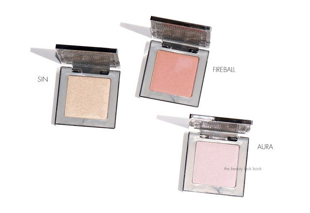 Shimmer-frost wise I think these are definitely on the more shimmery side but they blend out smoothly on the skin. Sin is the most frosted on me since it has a sharper contrast to my olive skintone. I expected Aura to look really frosty but on the face it gives the skin a pretty glimmer. Fireball has a smooth shimmer that isn’t overly frosted. I didn’t have time to reswatch comparisons, but Fireball is similar to the Anastasia Hard Candy Highlighter reviewed here and Aura compared to the Laura Mercier Highlighters in this post here. Sin is one of the more unique shades I own for highlighters but it has a similar effect to that of MAC Nylon Eyeshadow.
