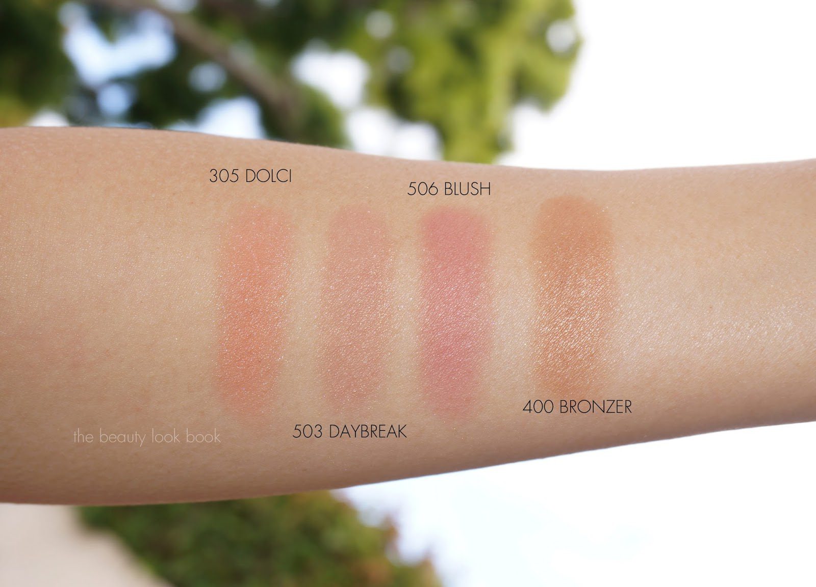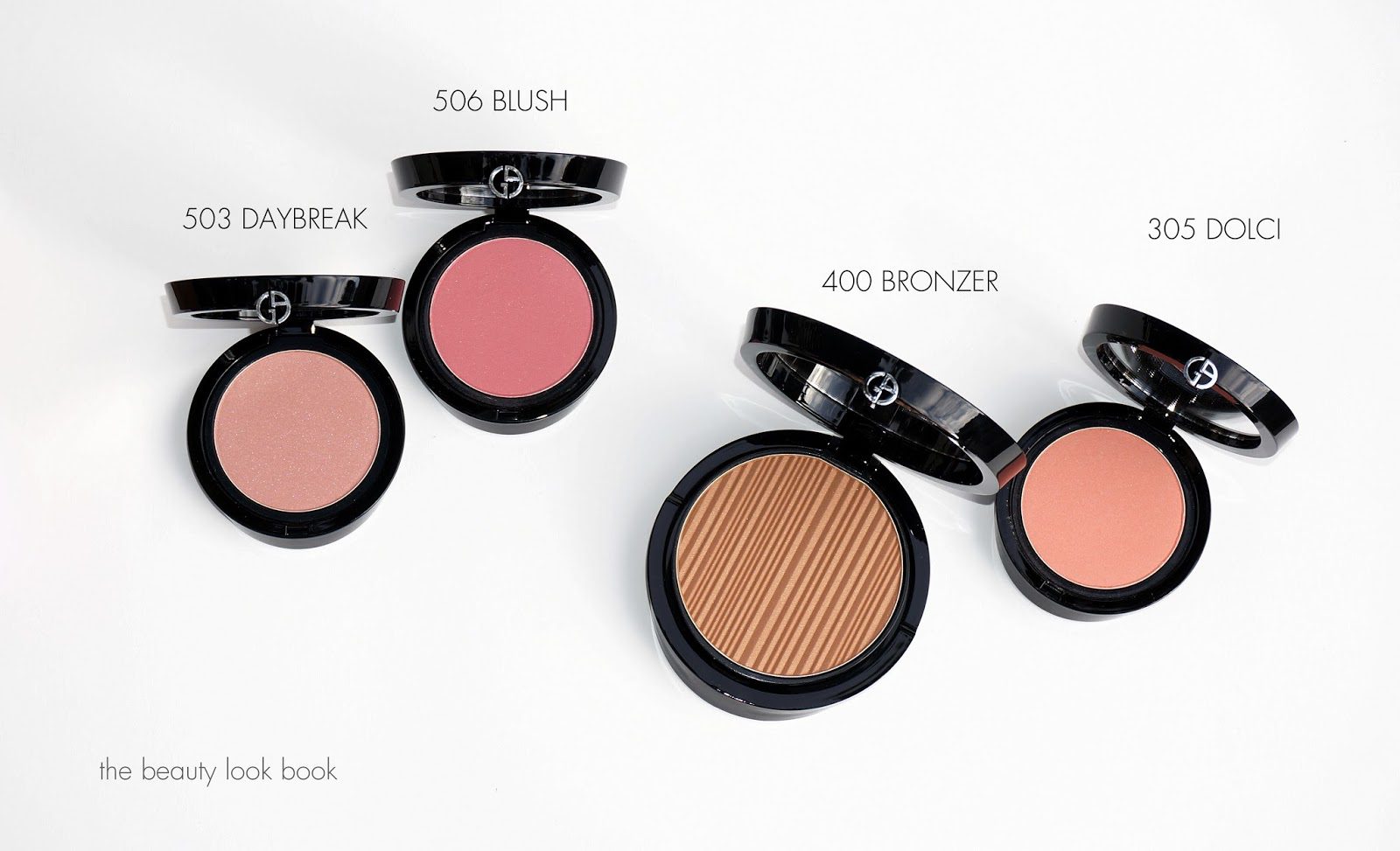 The colors I have to show you are Cheek Fabrics in Daybreak 503 (a soft pink beige), Blush 506 (soft rose pink), Sun Fabric 400 (warm bronze) and Dolci 305 (soft peach). All the colors I picked out have a soft luminous shimmer that doesn’t really show up on the skin. These really are like second-skin and blend in very naturally with the cheeks. They have similar pigment to the original Armani Sheer Blush and Bronzers.