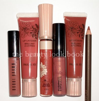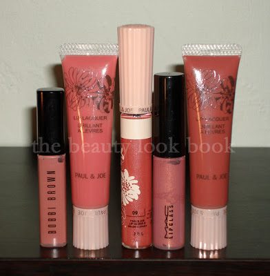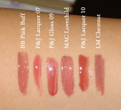 L to R: Bobbi Brown Pink Buff, P&J Lacquer 07, P&J Lipgloss 09, MAC Lovechild, P&J Lacquer 10